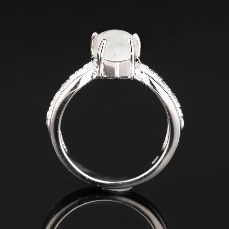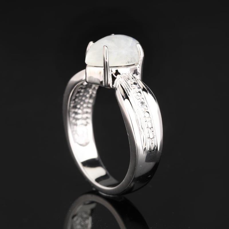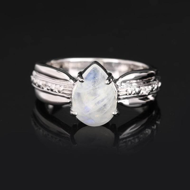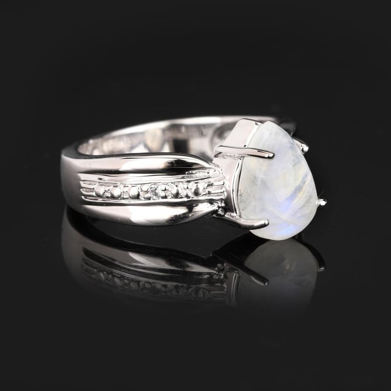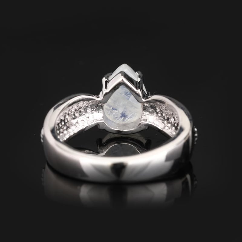 Ethereal Elegance: White Rainbow Moonstone & White Topaz RingStep into a world of celestial beauty with this exquisite ring, showcasing a mesmerizing White Rainbow Moonstone cabochon, perfectly cut into a 10x7mm pear shape. This enchanting gem captures the light with its iridescent shimmer, revealing a delicate play of colors reminiscent of a tranquil moonlit night. Flanking this stunning centerpiece are two sparkling round White Topaz stones, each measuring 1.30mm, adding a touch of brilliance and enhancing the overall allure of the design.Crafted with meticulous attention to detail, this ring embodies elegance and sophistication, making it a perfect statement piece for any occasion. The harmonious combination of the luminous moonstone and glimmering topaz creates a captivating contrast that draws the eye and sparks conversation. Whether worn as a signature piece or a cherished gift, this ring promises to elevate any jewelry collection, embodying the essence of timeless beauty and refined luxury. Don’t miss the opportunity to own a piece that radiates both grace and charm.