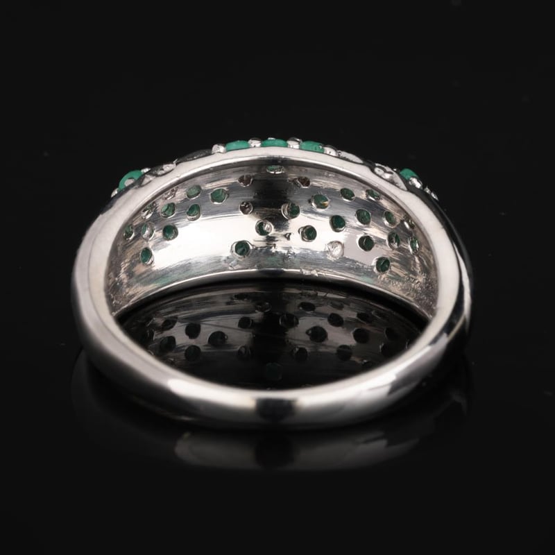 Exquisite Sakota Emerald and White Topaz Ring – A Dazzling Symphony of Elegance Embrace the allure of nature's finest treasures with this stunning ring, meticulously crafted to enchant and inspire. At its heart, a breathtaking array of twenty 1.90mm Sakota Emeralds and thirteen 1.80mm Sakota Emeralds dance harmoniously, evoking the vibrant green hues of lush forests and serene landscapes. Each emerald, renowned for its remarkable clarity and rich saturation, is expertly set to maximize its brilliance, creating a captivating visual feast. Complementing the rich emeralds are two sparkling 0.90mm White Topaz stones, delicately nestled within the design. Their crystalline purity and sparkling brilliance serve as the perfect contrast, enhancing the lush green tones of the emeralds and adding an element of exquisite sophistication to this remarkable piece. This ring is not just a piece of jewelry; it is a statement of elegance, a symbol of timeless beauty, and an invitation to indulge in the luxurious world of fine gemstones. Whether worn on special occasions or as a dazzling everyday adornment, this piece promises to elevate any ensemble, making it a must-have for discerning collectors and connoisseurs alike. Don’t miss this rare opportunity to own a true masterpiece that embodies the essence of elegance and sophistication.