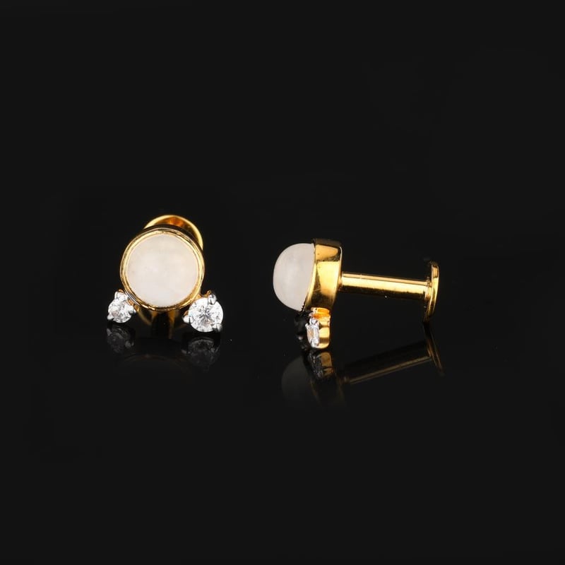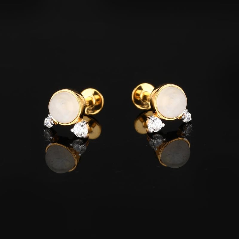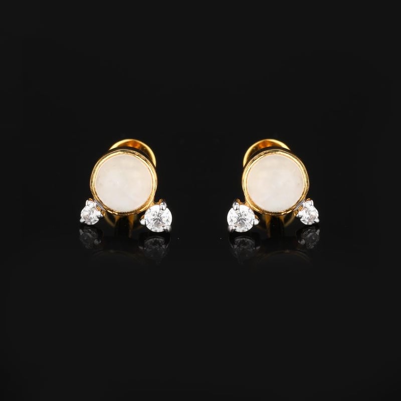 Ethereal Elegance: White Rainbow Moonstone and Cubic Zirconia EarringsIndulge in the enchanting allure of these exquisite earrings, where nature's artistry meets masterful craftsmanship. At the heart of this captivating design lies a divine 4.00mm round White Rainbow Moonstone, radiating a soft luminescence that dances with every flicker of light. Known for its ethereal glow and mystical qualities, this gemstone is a true embodiment of serenity and elegance.Surrounding the mesmerizing moonstone are delicate accents of White Cubic Zirconia, with a 2.00mm round stone and a refined 1.50mm round stone, each expertly set to enhance the overall brilliance of the piece. These sparkling gems create a harmonious balance, adding a touch of glamour while ensuring the moonstone remains the focal point of admiration.Set in luxurious white rhodium-plated prongs, these earrings exude a contemporary sophistication that complements any attire. The rhodium finish not only amplifies their brilliance but also provides lasting protection, ensuring that this treasure shines for years to come. Perfect for a night out or a special occasion, these earrings are a timeless addition to any jewelry collection, inviting compliments and admiration with every wear. Elevate your elegance with this stunning piece, where each element tells a story of beauty and grace.