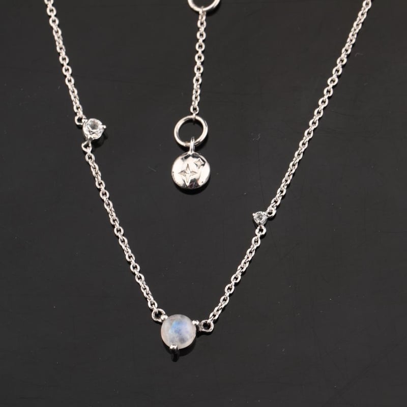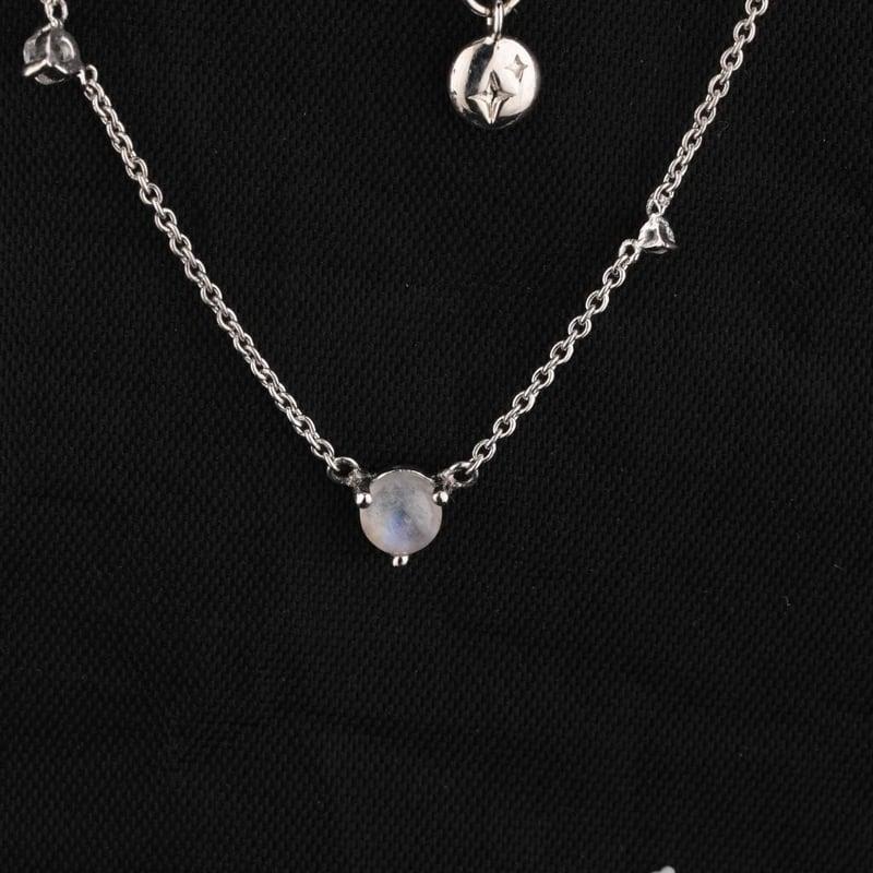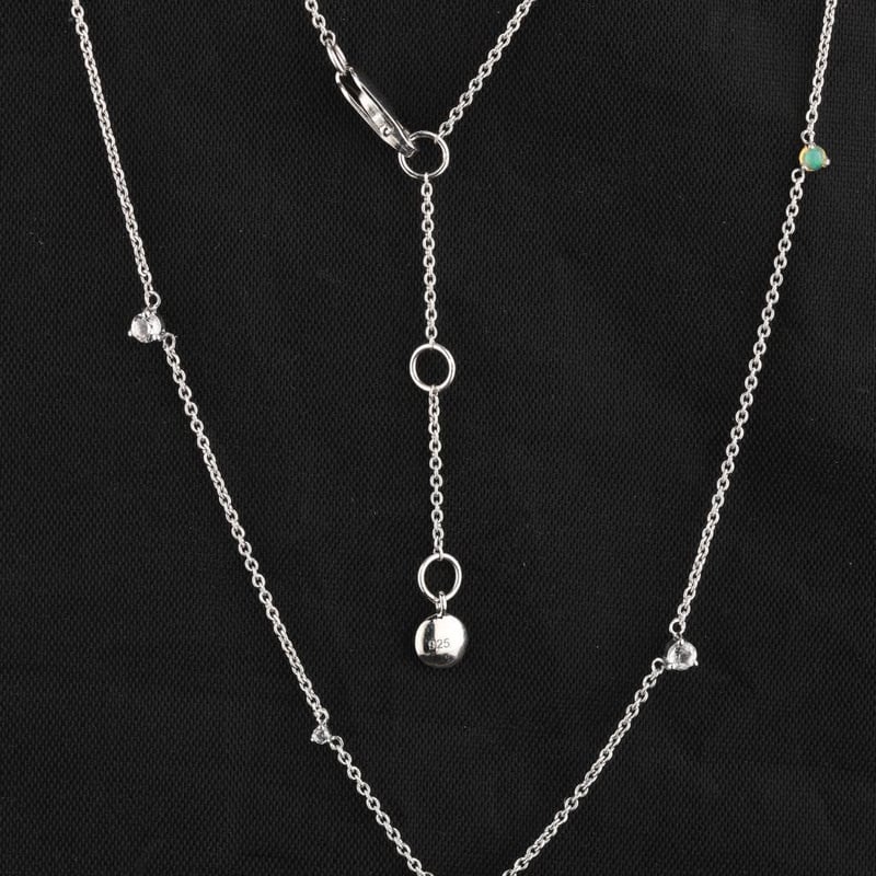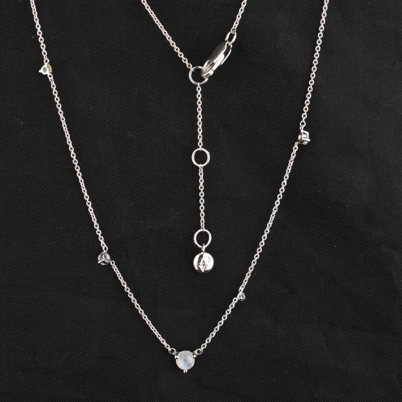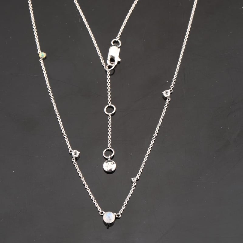 Ethereal Elegance: Exquisite Multi-Stone NecklaceStep into a realm of celestial beauty with this enchanting necklace, a harmonious symphony of luminescence and color. At its heart lies a mesmerizing 4.00mm round White Rainbow Moonstone, celebrated for its ethereal glow that dances with shades of blue and silver, akin to the soft light of a full moon illuminating a tranquil night.Flanking this radiant centerpiece are delightful Ethiopian Opals, each 2.00mm round gem exuding a kaleidoscope of fiery hues that shimmer and shift, reminiscent of an opalescent sunrise. The addition of two dazzling 2.50mm round White Topaz stones further enhances this piece, their pristine clarity and brilliance capturing the light and reflecting it with an effervescent sparkle. Completing the ensemble is a singular 1.50mm round White Topaz, adding a touch of delicate sophistication.Crafted with meticulous attention to detail, this necklace is not just an accessory; it is a statement of refined elegance and artistry. Ideal for the discerning individual who appreciates the natural beauty of gemstones, this piece will effortlessly elevate any attire, from a formal evening gown to casual chic.Bid now for a chance to own this extraordinary necklace and embrace the allure of nature's finest treasures.