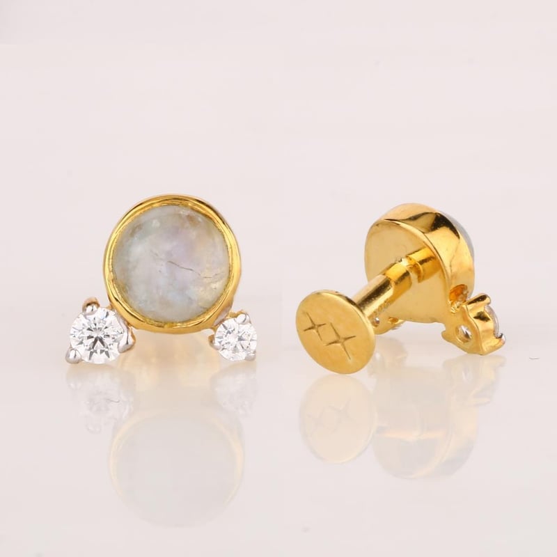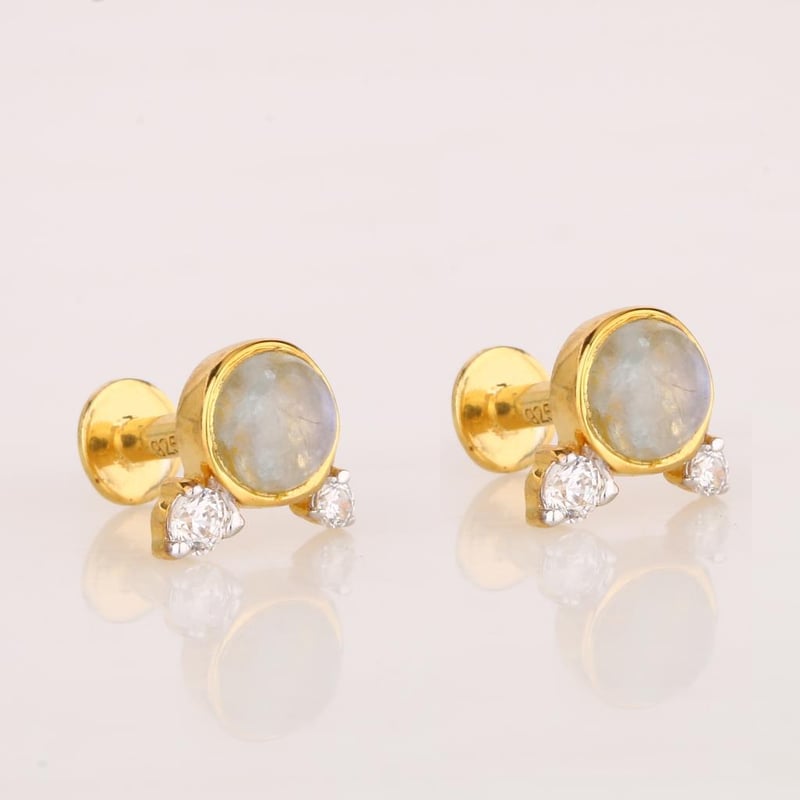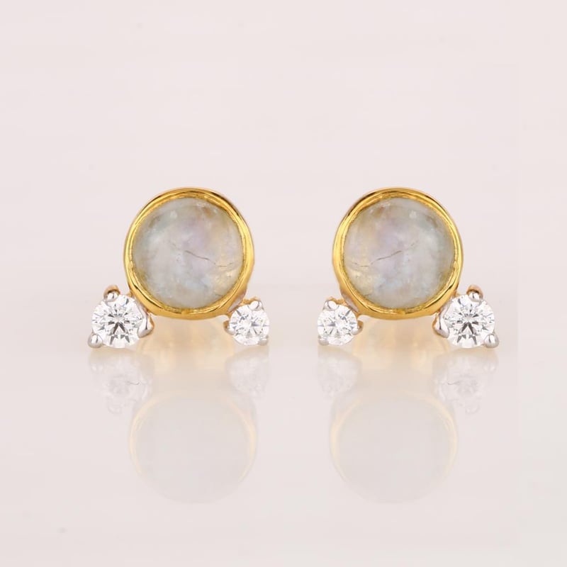 Ethereal Harmony: White Rainbow Moonstone and White Topaz EarringsStep into a realm of celestial beauty with these exquisite earrings, featuring a stunning combination of White Rainbow Moonstone and brilliant White Topaz. At the heart of this masterpiece lies a captivating 4.00mm round White Rainbow Moonstone, its mystical sheen capturing the light with every movement, displaying an enchanting play of colors reminiscent of a soft moonlit night. Adorning this centerpiece are two exquisite White Topaz stones: one 2.00mm and another 1.50mm round gem, each adding a sparkling brilliance that enhances the ethereal quality of the moonstone. These hand-selected stones are meticulously set in a refined design that allows for the perfect interplay of light, creating an accessory that is both elegant and versatile.Ideal for any occasion, whether a formal event or an intimate gathering, these earrings are destined to make a statement. Embrace the allure of nature’s finest creations and elevate your jewelry collection with this enchanting pair that promises to illuminate your beauty and captivate hearts.