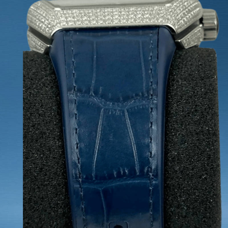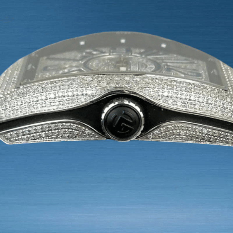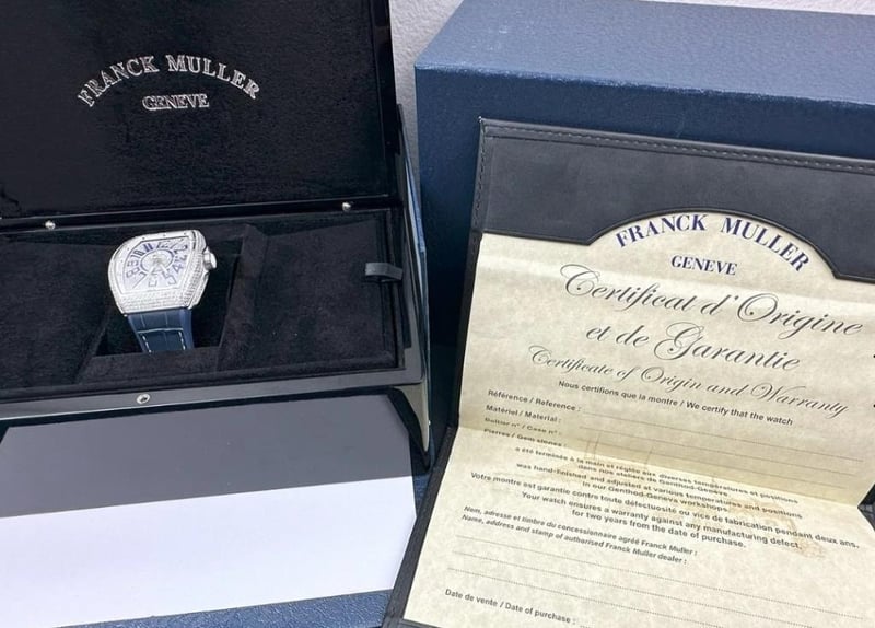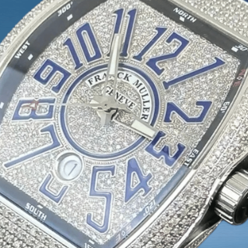 FRANCK MULLER V45 DIAMOND BLUE NUMBERS Brand: Franck Muller Model Number: VANGUARD Reference Number: V45 SC DT AC Production Year: UNKNOWN Dial: DIAMOND Case: STEEL / DIAMOND Case Size: 45MM Bracelet: STEEL / DIAMOND Movement: AUTOMATIC Aftermarket Natural DiamondsBox: YesPapers: Yes Condition: Good - Refer to Images