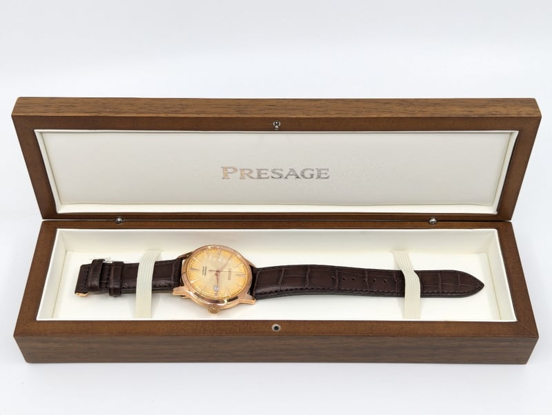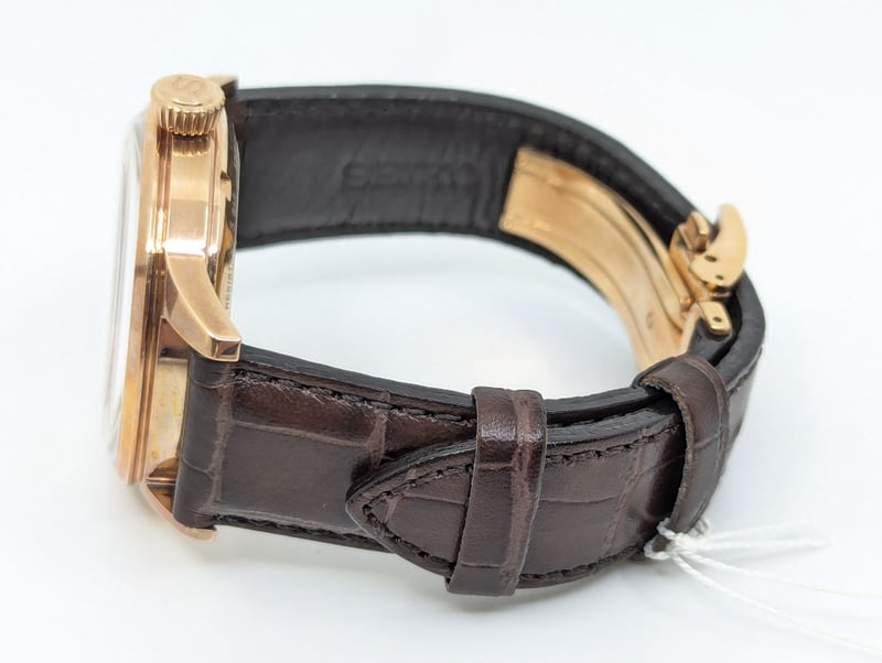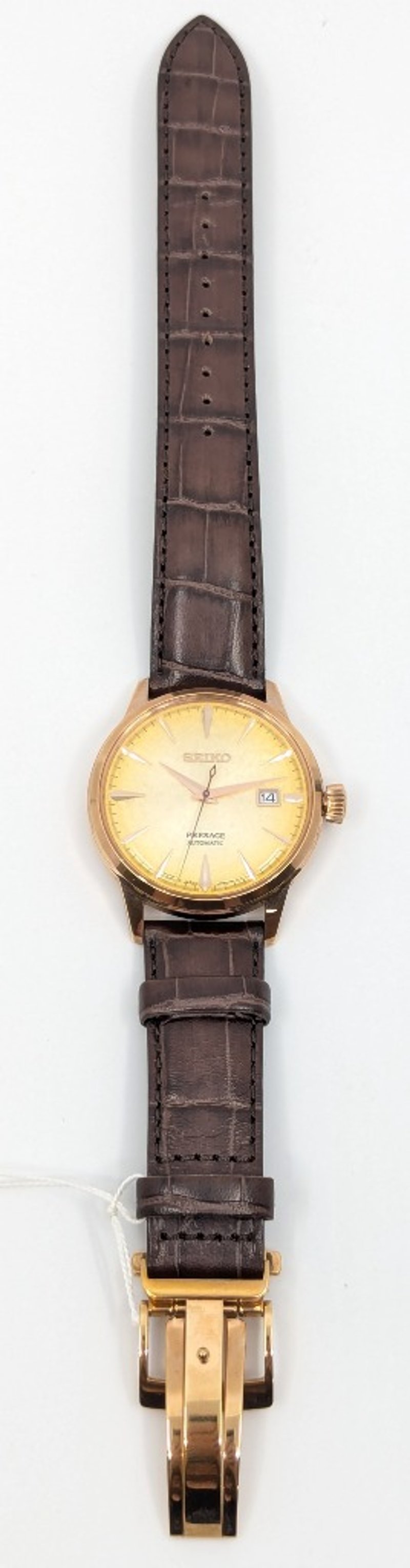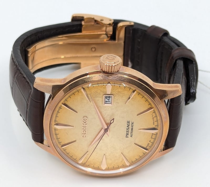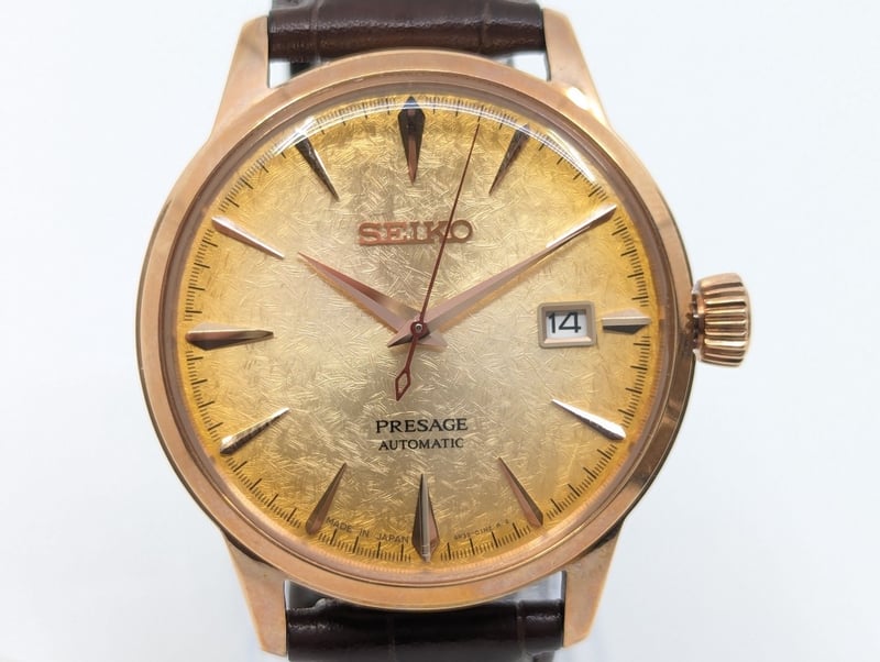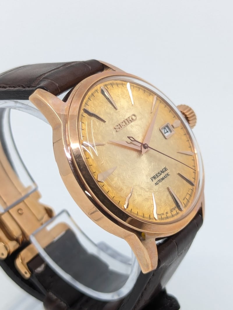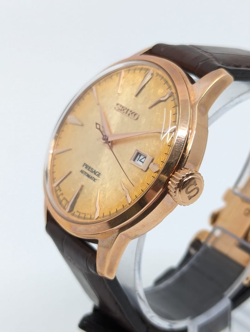 LIMITED EDITION SEIKO PRESAGE COCKTAIL IRORI MOMENTS SRPK50J DIAL: FAUX GOLD DIALCASE DESCRIPTION: GOLD PLATED STAINLESS STEELCASE SIZE: 40.5MMBRACELET: LEATHER BRACELETMOVEMENT: AUTOMATICBOX: INCLUDEDPAPERS: NOT INCLUDEDAdditional Information: Non Numerical Hour Markers Date Display At 3 O'Clock PositionFold Buckle ClaspWater Resistant: 5 BarEdition Number: 903/1000Includes Certificate Of Guarantee586301+11