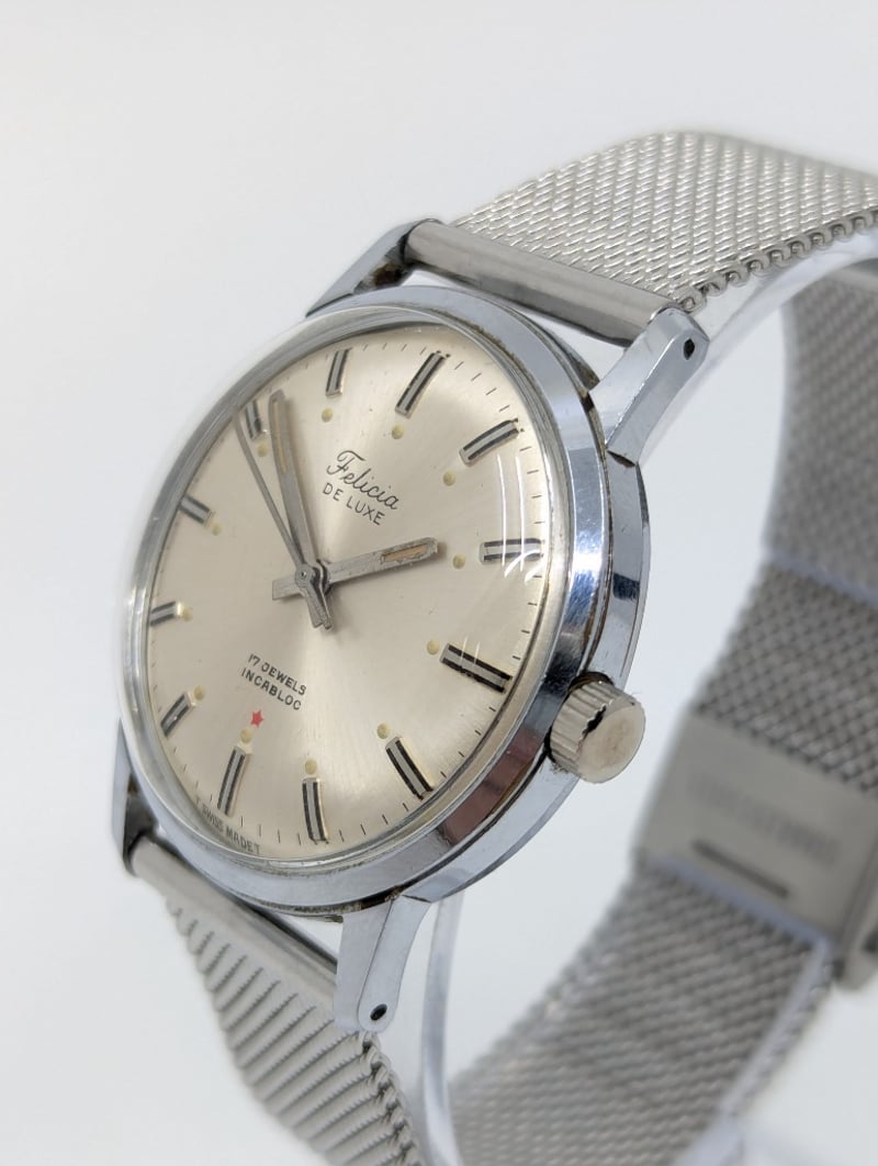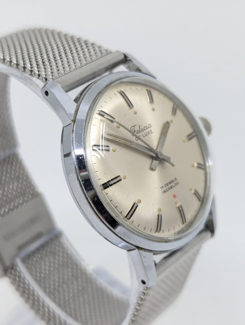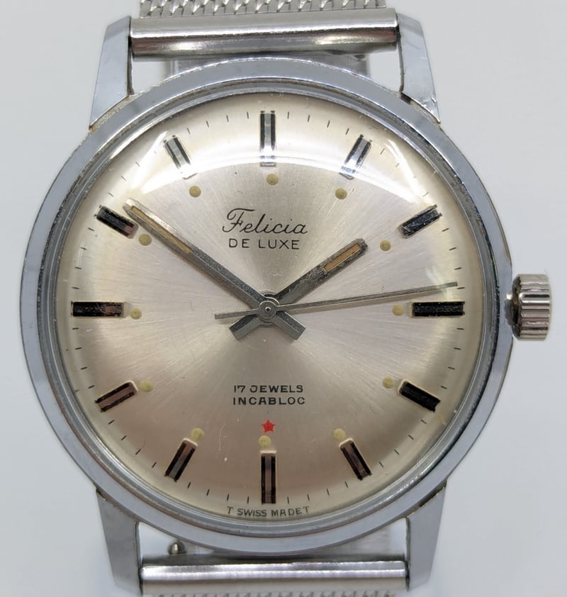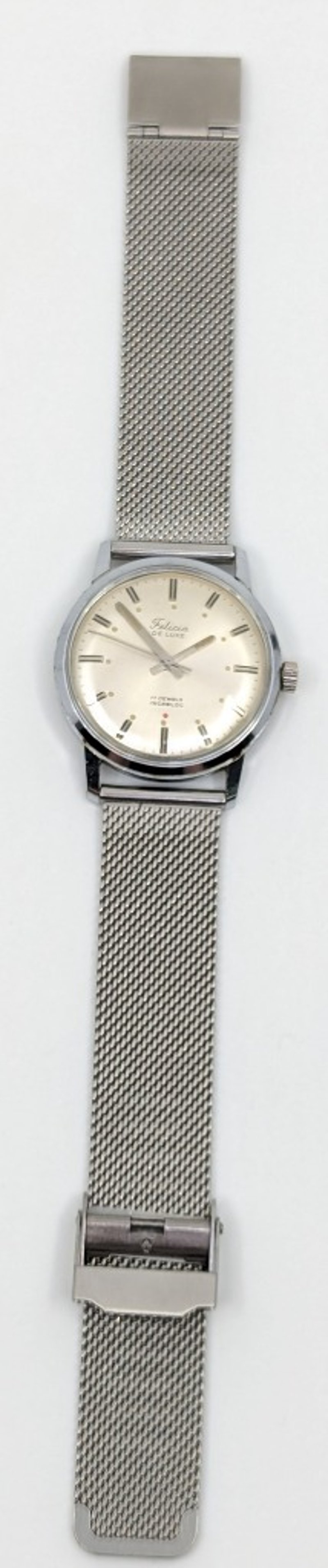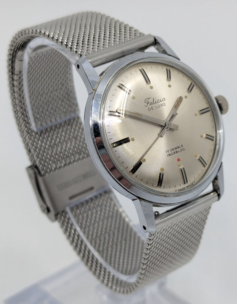 FELICIA DE LUXE 17 JEWELS INCABLOC DIAL: SILVER DIALCASE DESCRIPTION: STAINLESS STEELCASE SIZE: 34MMBRACELET: STAINLESS STEELMOVEMENT: MANUAL WINDBOX: NOT INCLUDEDPAPERS: NOT INCLUDEDCondition: Good - Refer To ImagesAdditional Information: Non Numerical Hour Markers586301+4