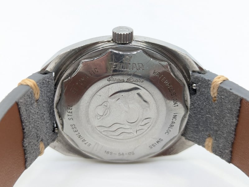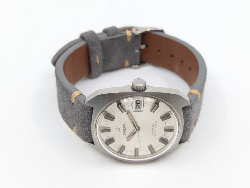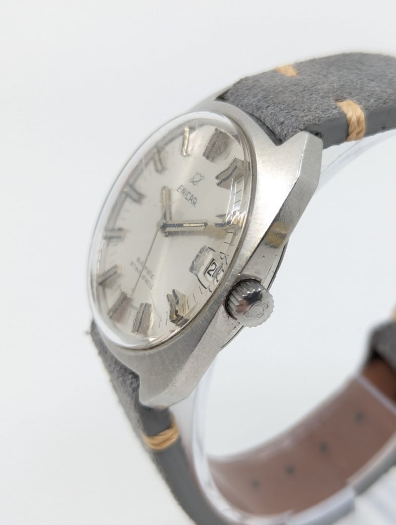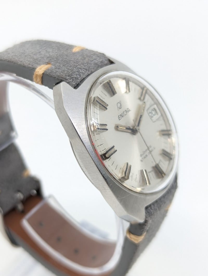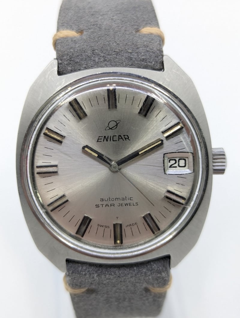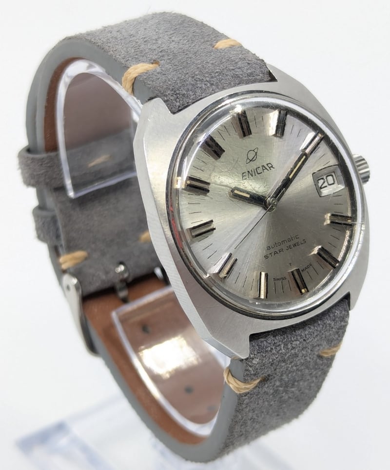 ENICAR STAR JEWELS DIAL: SILVER DIALCASE DESCRIPTION: STAINLESS STEELCASE SIZE: 35MMBRACELET: LEATHER STYLEMOVEMENT: AUTOMATICBOX: NOT INCLUDEDPAPERS: NOT INCLUDEDCondition: Good - Refer To ImagesAdditional Information: Non Numerical Hour MarkersDate Display At 3 O'Clock PositionLuminous HandsBuckle Clasp17 Jewels586301+7