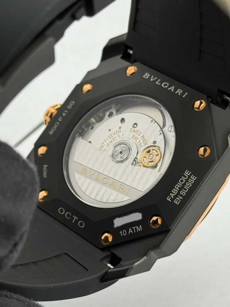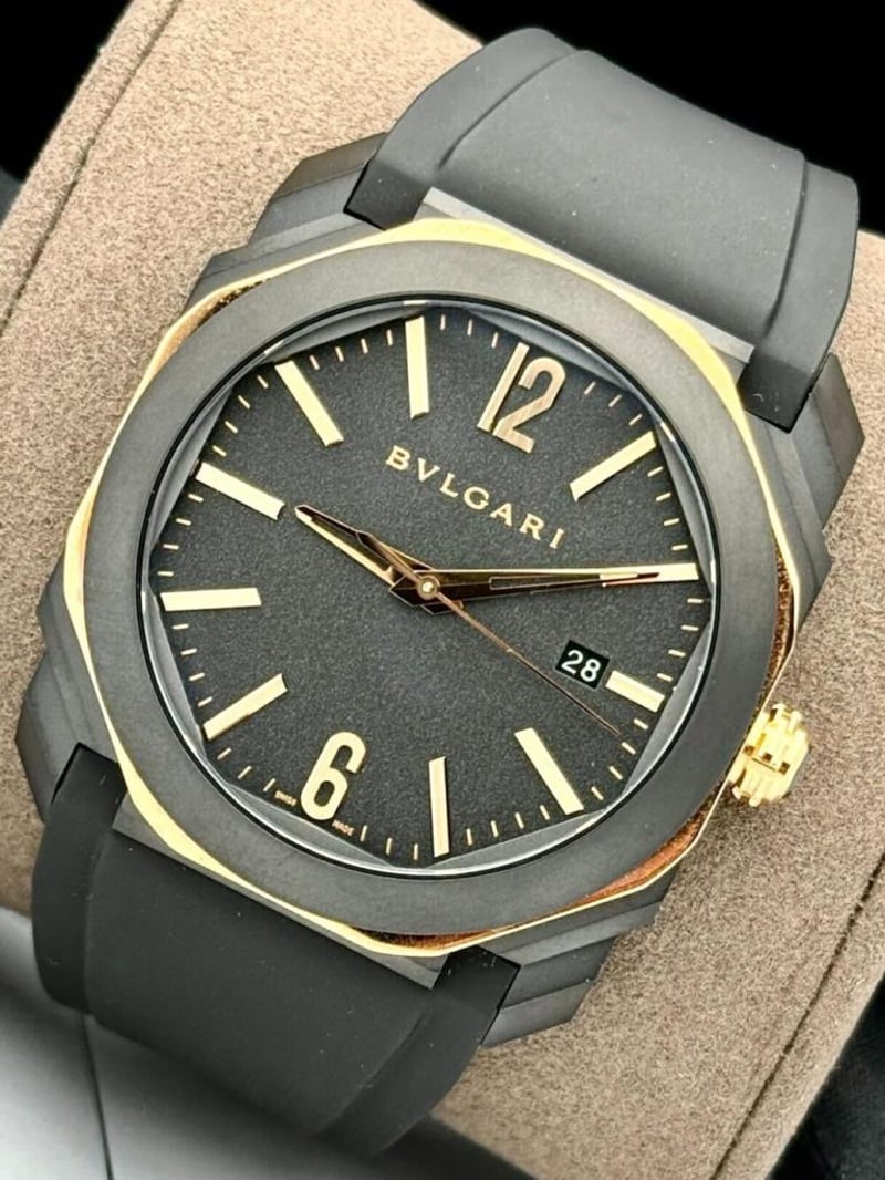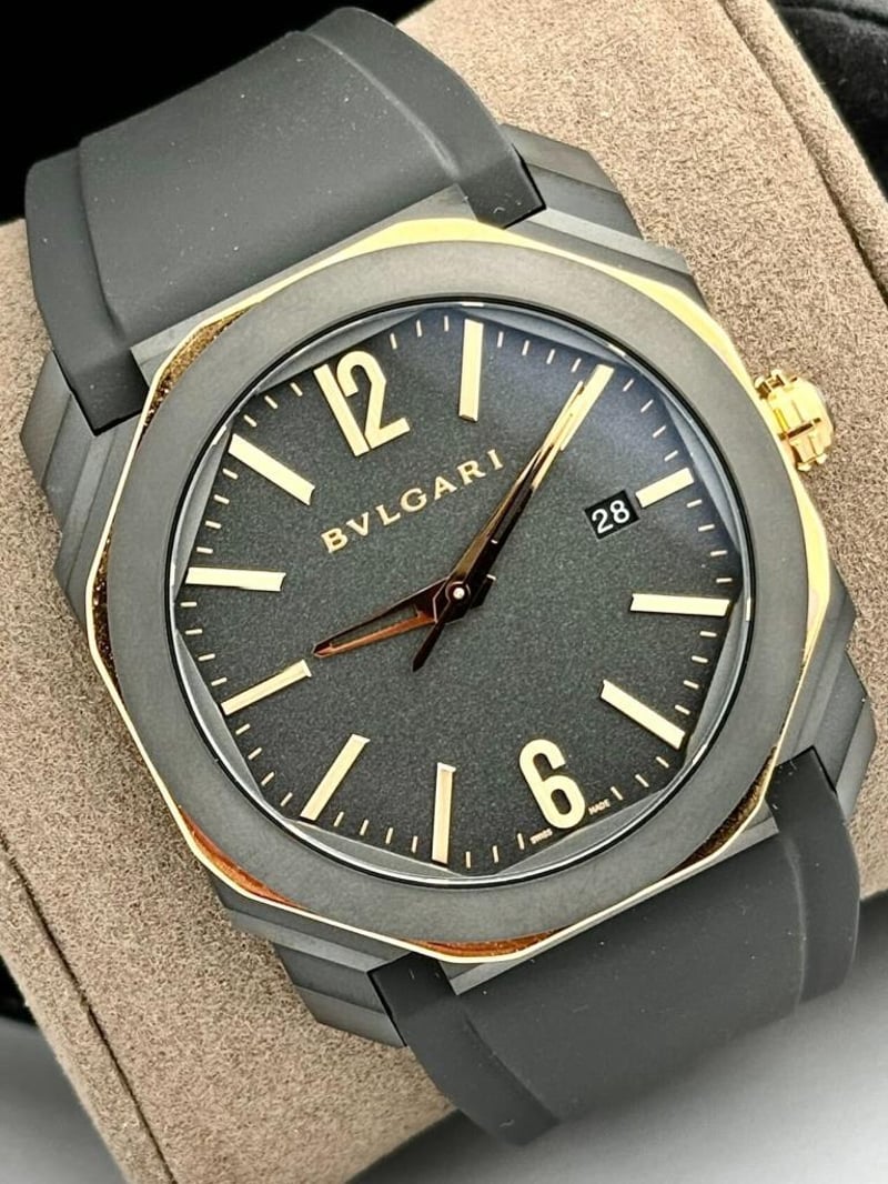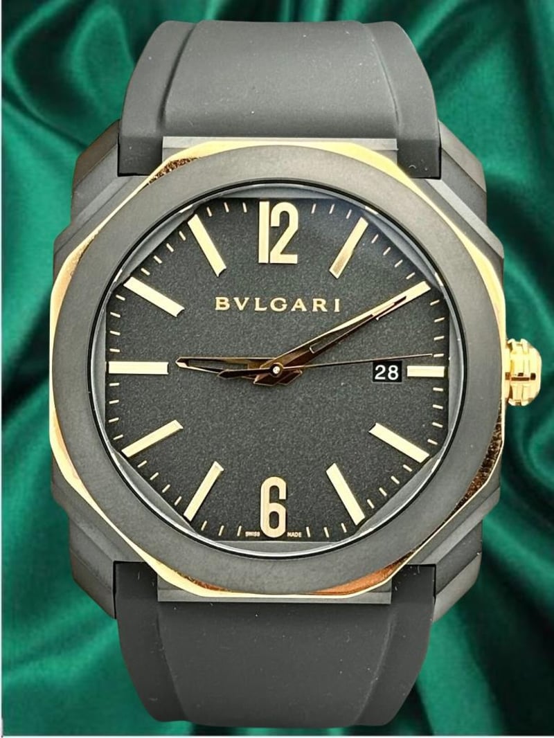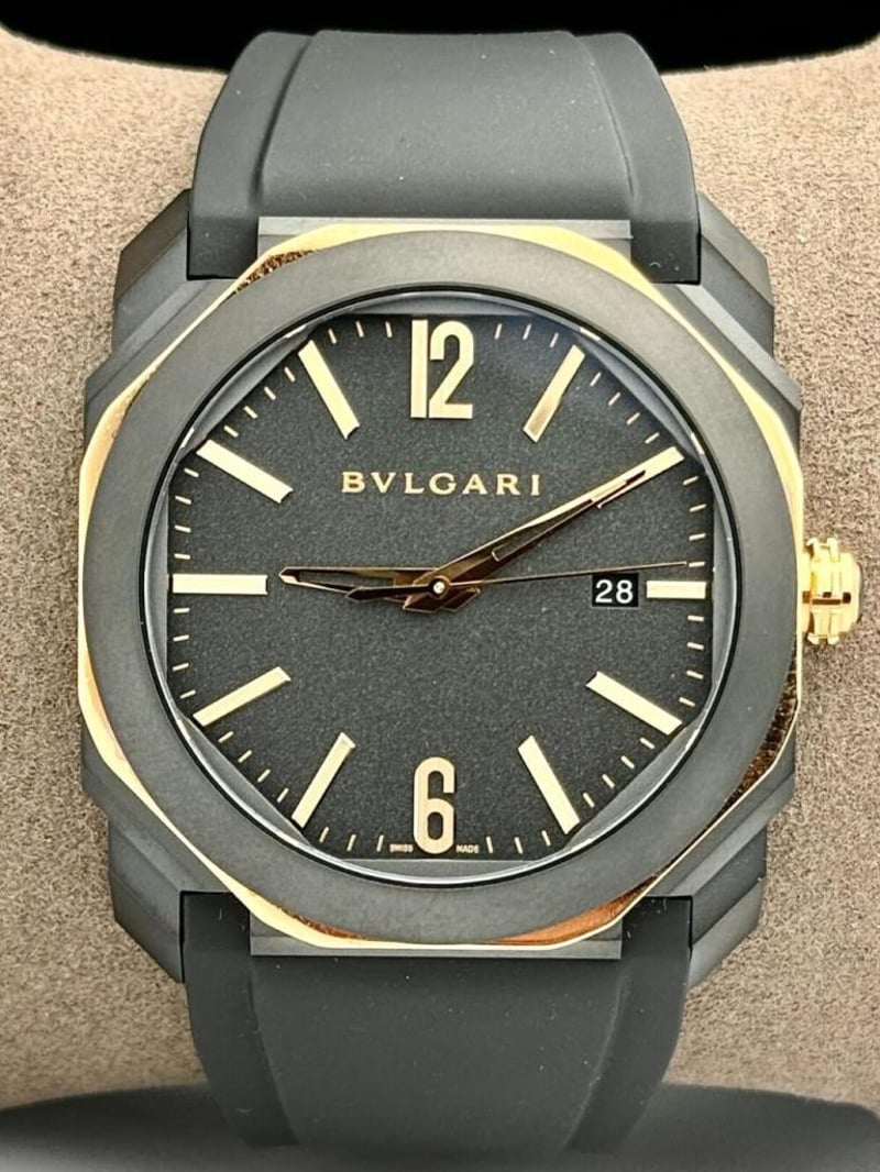 BULGARI OCTO BLACK ROSE GOLD ACCENTS 103085 | 2022 | 41MM Brand : BulgariReference : 103085Model : OctoYear : 2022Case Size : 41MmPower Reserve : 42HDial : BlackBezel : SteelCase : SteelBracelet : RubberPapers : YesBox : Yes Condition: Good - Refer Images 0488240+37
