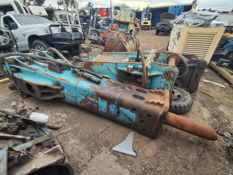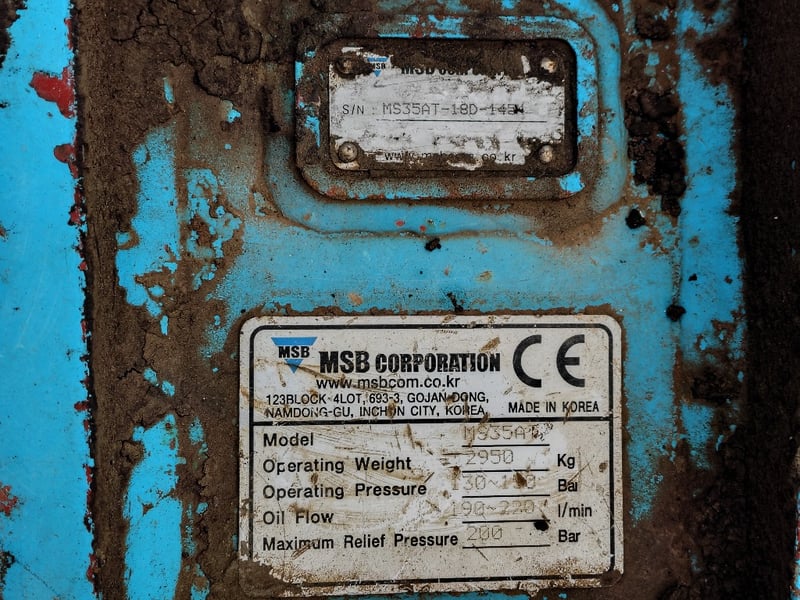 MSB MS35AT Hydraulic 35T Rock breaker AttachmentMake: MSBModel: MS35ATBody: Hydraulic Rock breakerOperating Weight: 2,950 kgOperating Pressure: 130~150 BarOil Flow: 190~220 I/minMax Relief Pressure: 200 BarS/N: MS35AT-18D-1454Pin: 90mmCenter: 390mmBetween the Ears: 520mmLocation: Campbellfield, VIC 3061 (Not in Lloyds Branch) Collection and Inspection by Appointment onlyHydraulic breaker attachment for excavator or similar heavy machinery. MSB Corporation model (Korean manufactured), serial number MS35AT-18D-1454. Cast steel construction with reinforced frame featuring dual mounting points and integrated hydraulic cylinder housing. Equipped with twin flexible hydraulic hoses and pressure relief system. Heavy-duty chisel bit with conical tip design for rock breaking and demolition work. Complete with control valve assembly and accumulator chamber. Suitable for construction, demolition, and quarrying applications. Functional components intact though cosmetic wear evident from operational use.