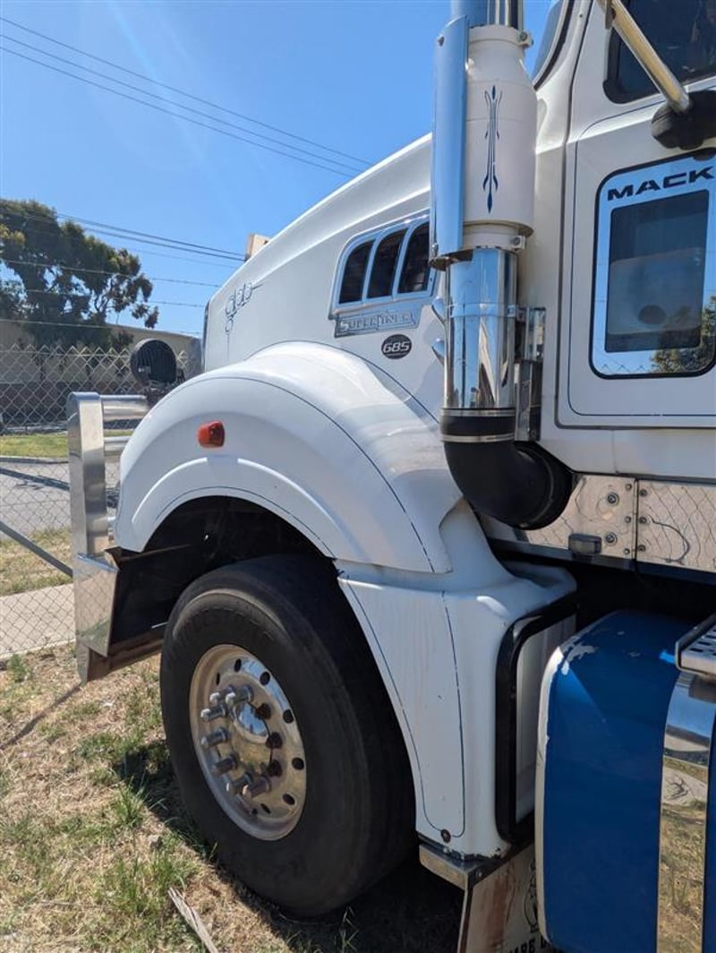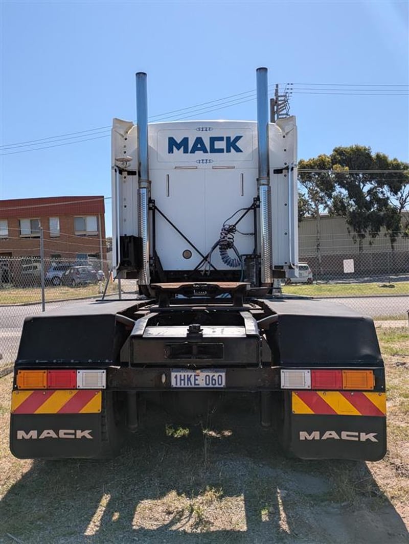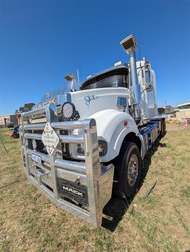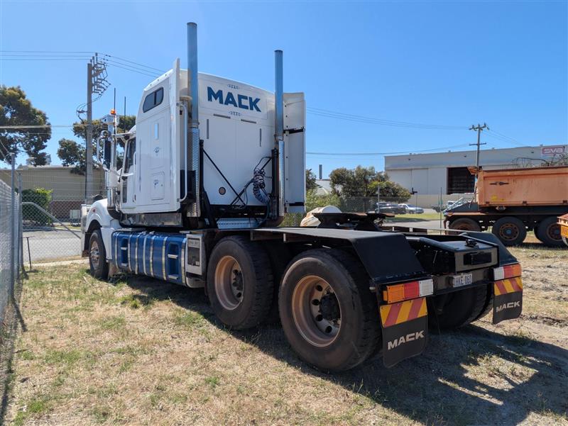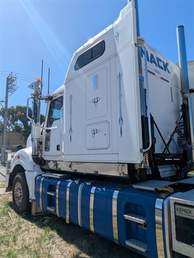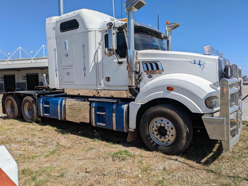 2015 Mack Trident 685 CLX 6x4T Superliner Year: 2015Make: MackModel Name & Number: Trident CLX 6x4T SuperlinerConfiguration: 6x4 Prime MoverBody: Sleeper CabEngine Details: Mack MP10-685 16.1L 6 CylTransmission: AutomaticOdometer Indicated: 1,941,539kmsFuel Capacity: 2 x 400L Diesel Tanks (800L Total Capacity)Colour: White with Blue Fuel Tanks and DecalsSuspension: Airbag SuspensionEngine Number: MP10130045 AS PER PPSRV.I.N.: 6FMT14H79ED806072GVM: 28,000 kgsGCM: 131,000 kgsBattery Isolator, Bullbar, Spotlights, UHF Radio, Twin Exhausts, Sleeper with Mattress, Overhead Storage Lockers, Microwave, TV, Cabin Fan, and Custom Upholstered Roof Trim with Tassel Finish.Comments / Condition:Presents well for age with clean, comfortable interior. Both exhaust stacks show heat cracking and corrosion as pictured. Horn is not working. Only 1 Key Available. Sizeable crack on the drivers side of the windshield. - Motor Dealer Licence # MD27332Key #B2
