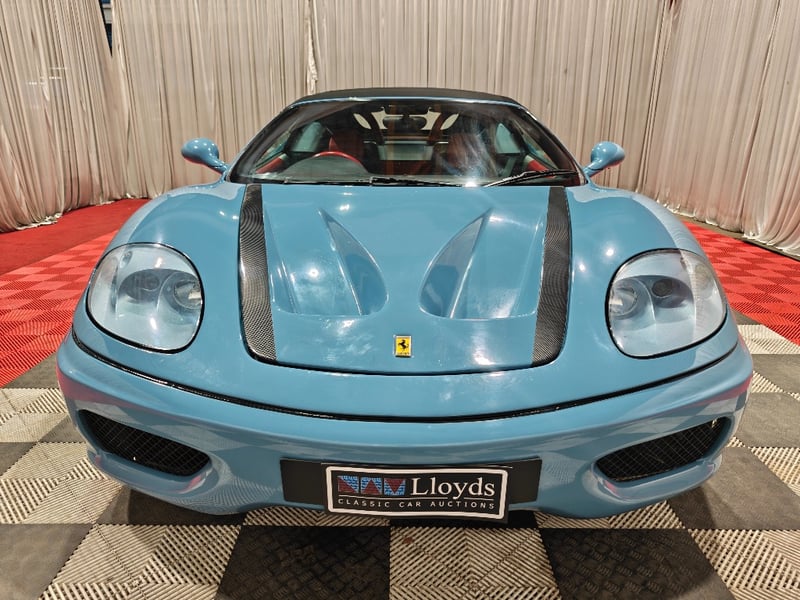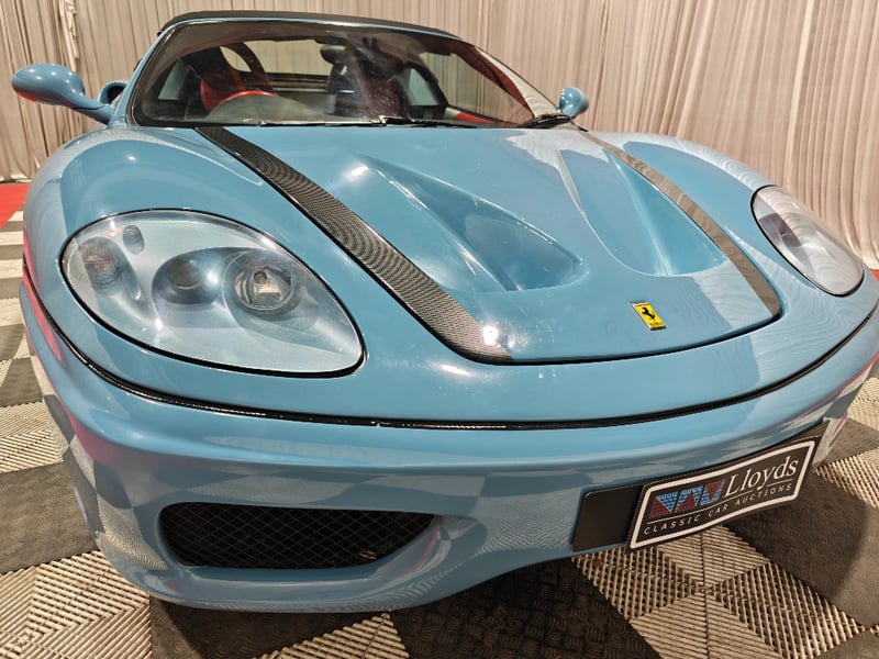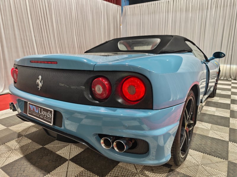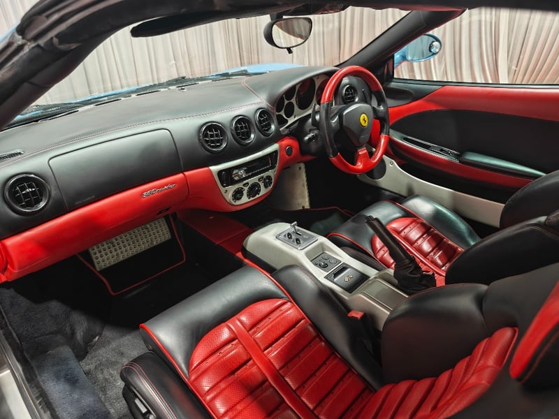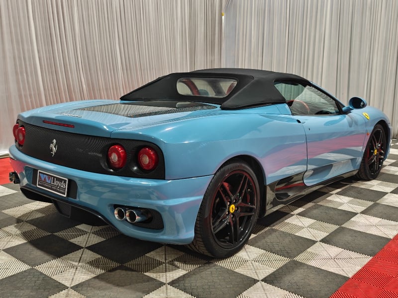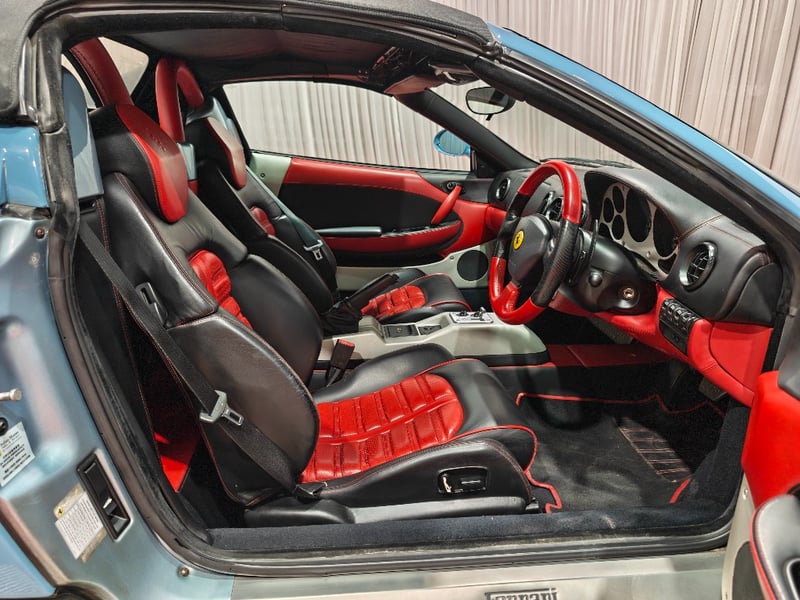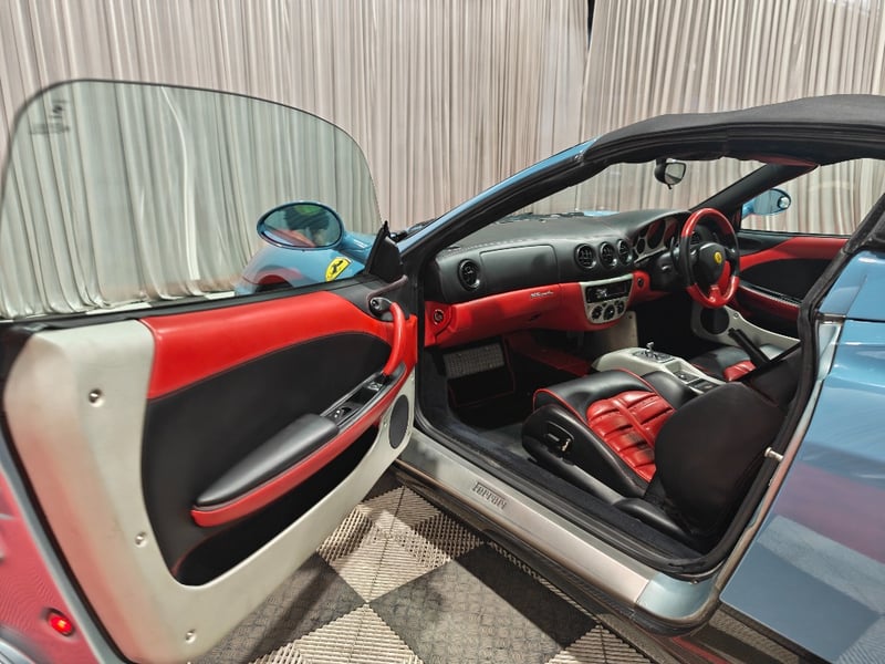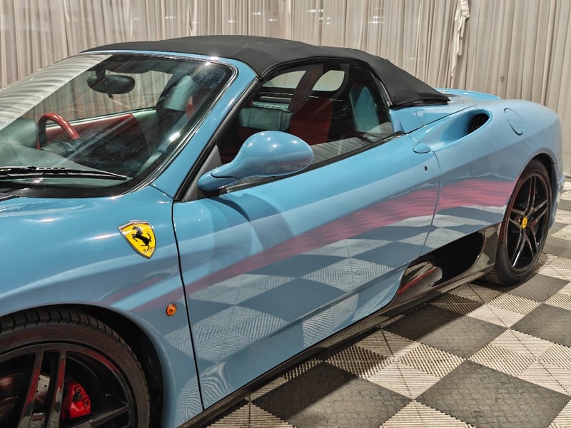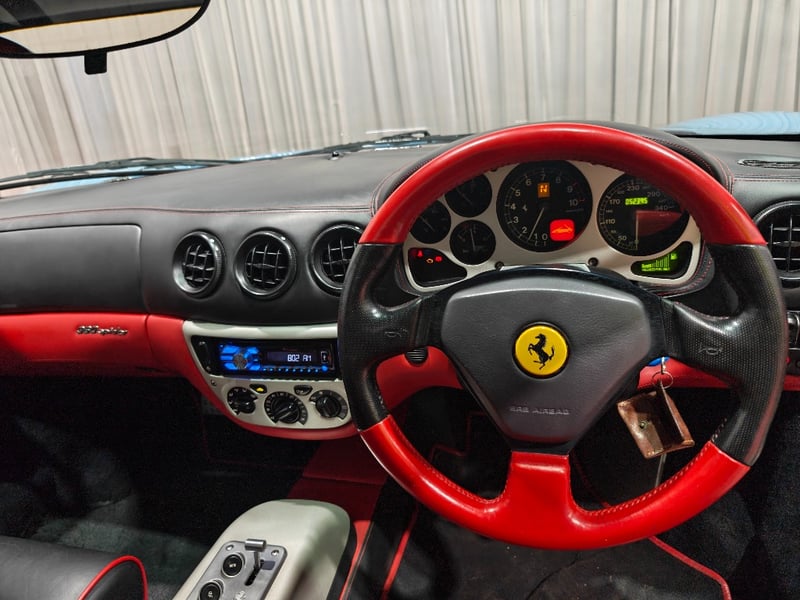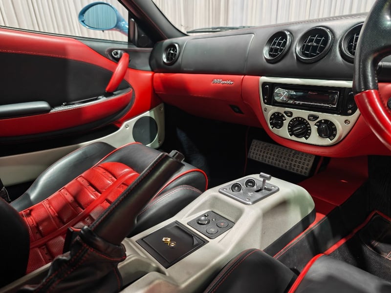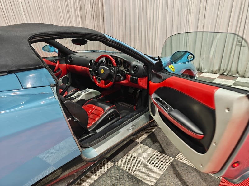 This exceptional Ferrari 360 Spider represents the pinnacle of early 2000s convertible sports car engineering. Finished in striking Azzurro Barchetta light blue with contrasting red leather interior, this 3.6-litre naturally aspirated V8-powered icon delivers authentic Italian sports car performance. The 6-speed manual transmission provides engaging mechanical connection, whilst the mid-mounted engine ensures perfect weight distribution. With approximately 52,345 kilometres on the odometer, this well-maintained example showcases the timeless design language that defined an era. The black canvas convertible top, carbon fibre trim elements, and iconic Ferrari red Brembo brakes exemplify the attention to detail throughout. Assembly number 39264 confirms originality, with matching engine and chassis documentation. The supple leather cabin, leather-rimmed steering wheel, and bespoke sports seats create an intimate driving environment. This 360 Spider represents a significant chapter in Ferrari's history, combining visceral naturally aspirated performance with open-air driving pleasure that modern turbocharged variants cannot replicate. Vehicle Includes Keys & Owners Manuel. Inspection Recommended.