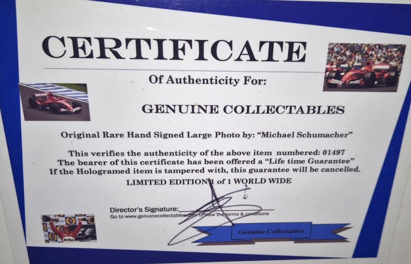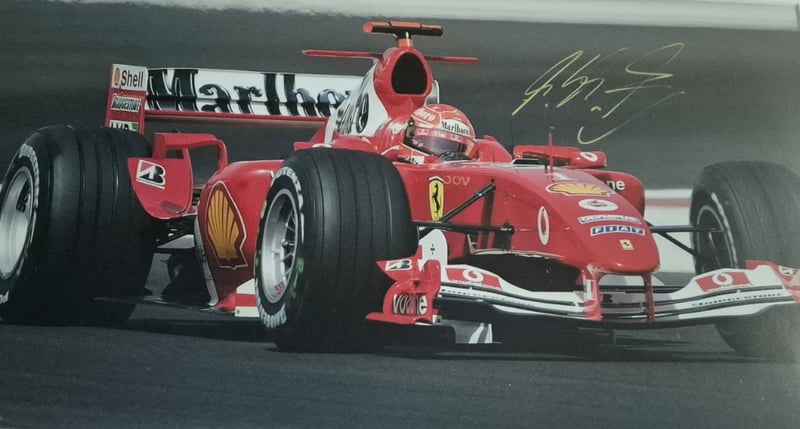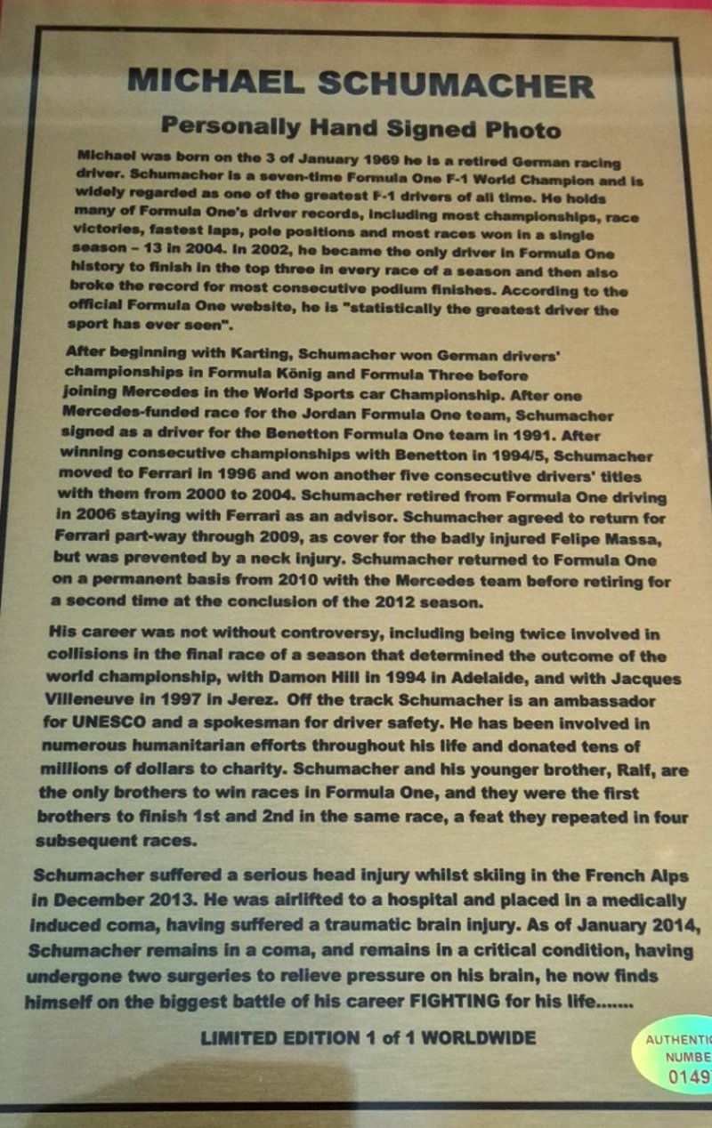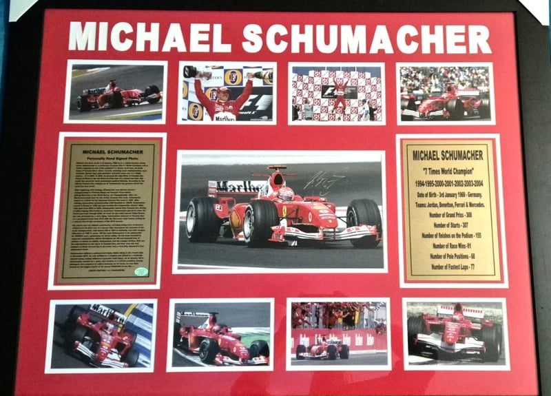 MICHAEL SCHUMACHER ORIGINAL HAND SIGNED FRAMED PHOTO. Accompanied by certificate of Authenticity.