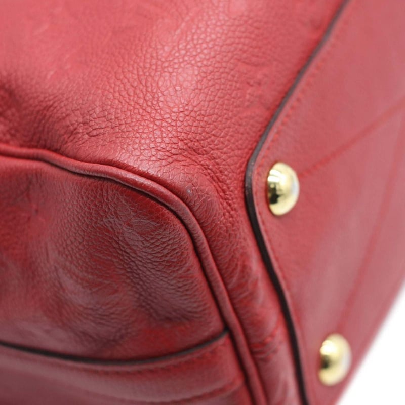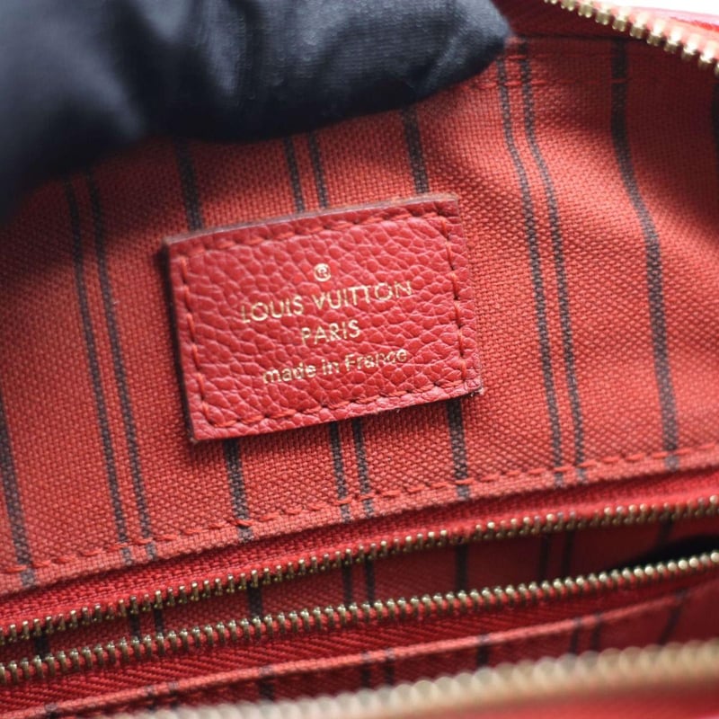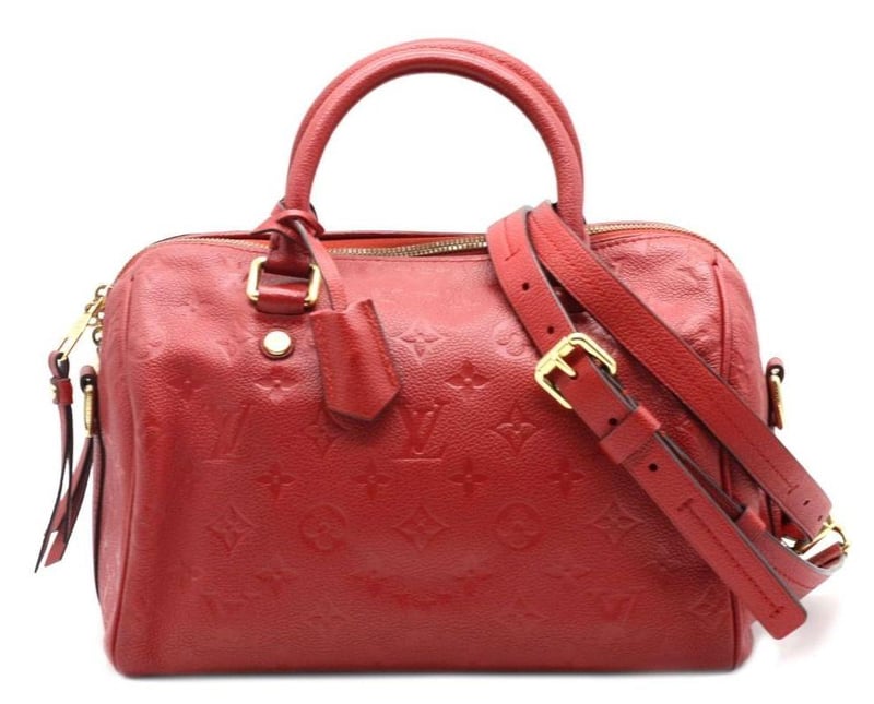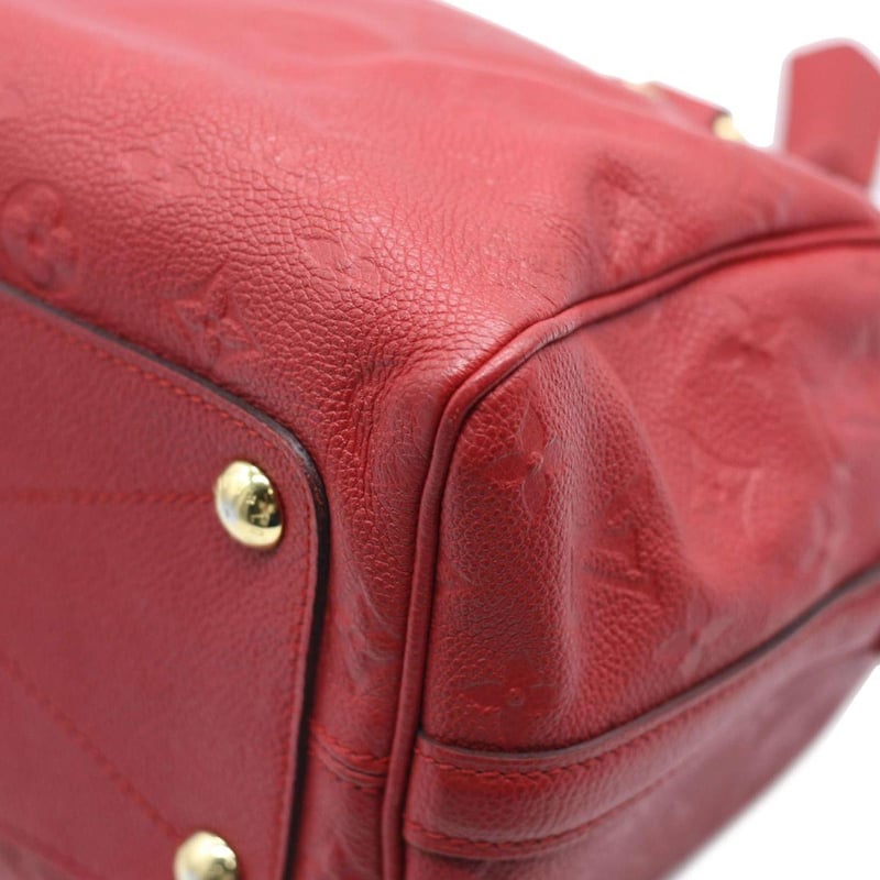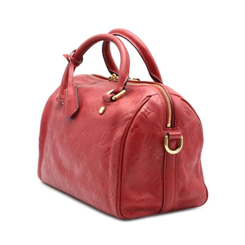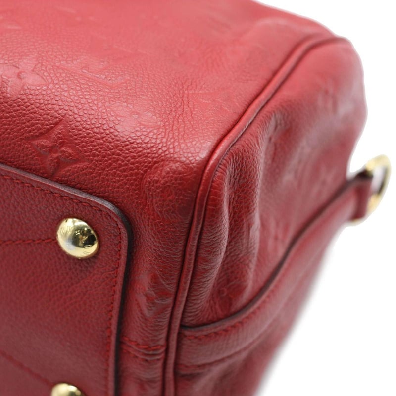 LOUIS VUITTON RED EMPREINTE SPEEDY BANDOULIERE 25 Length: 28cm Height: 18cm Depth: 14cm Handle Drop: 8cm Strap Drop: 48cm Detachable Adjustable Exterior Material Leather with gold-tone hardware, dual rolled top handles, top zip closure, protective metal feet and a shoulder strap. Interior Material Textile lining with a main compartment, a zipped pocket and two patch pockets. Additional Condition Report - Moderate sign of wear on exterior - Minor scuffs on exterior corners - Visible sign of wear and stains in interior - Moderate scratches on hardware Comes With - A Detachable Strap - Certificate of Authenticity CROSSED DOCKED 155307+45