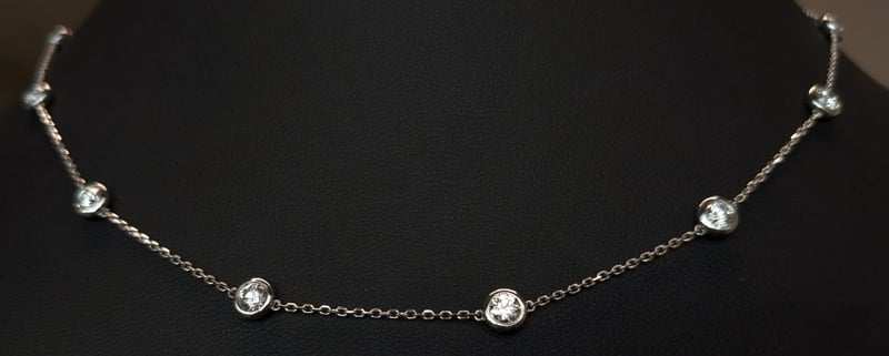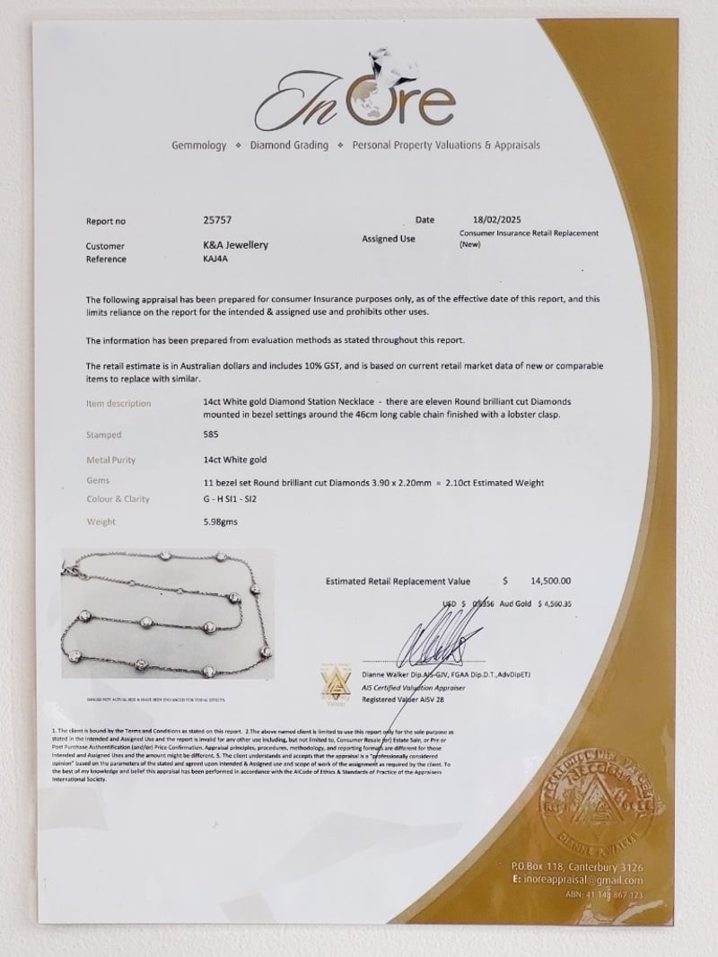 14K WHITE GOLD DIAMOND STATION NECKLACE There Are Eleven Round Brilliant Cut Diamonds Mounted In Bezel Settings Around The 46Cm Long Cable Chain Finished With A Lobster Clasp Total Item Weight: 5.98g Length: 46.00cm Markings: 585 Condition: Good - Refer To Images This valuation has been conducted by an independent third-party professional. The valuation amount is an assessment by the issuing valuer and does not reflect the auction value of the item. Any inquiries regarding the valuation should be directed to the issuing valuer (refer to contact details on the certificate), as Lloyds Auctions has no affiliation or influence over the valuation, the valuer, or the stated amount. Insurance Replacement Valuation Amount: $1.00 CROSSDOCK 162949+47