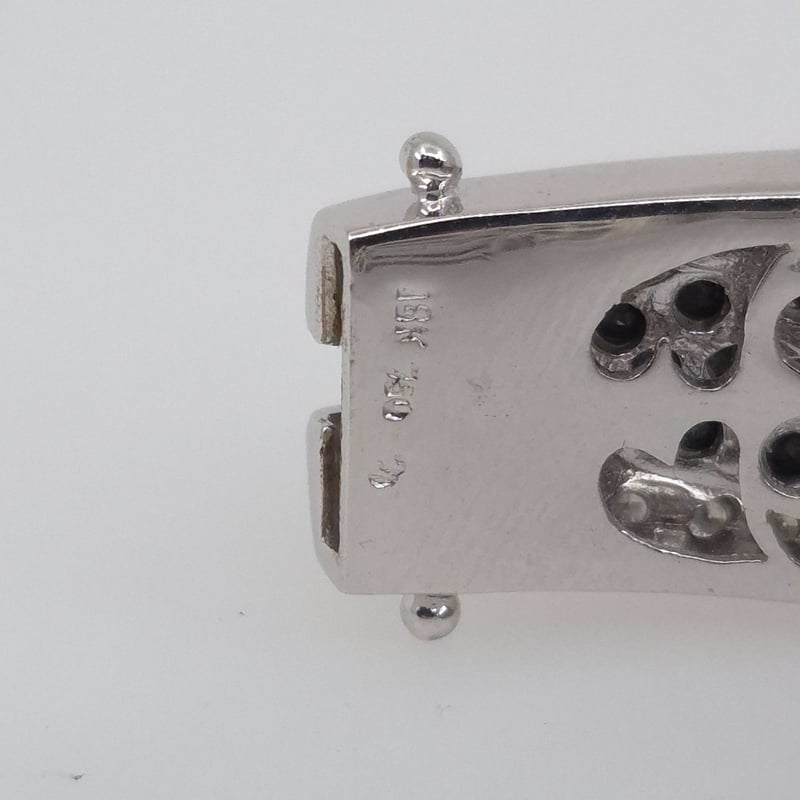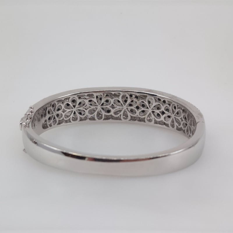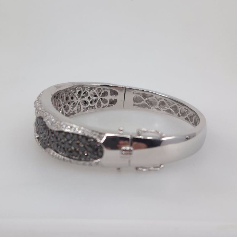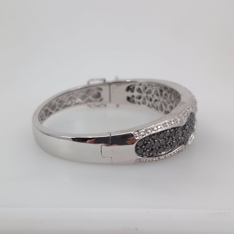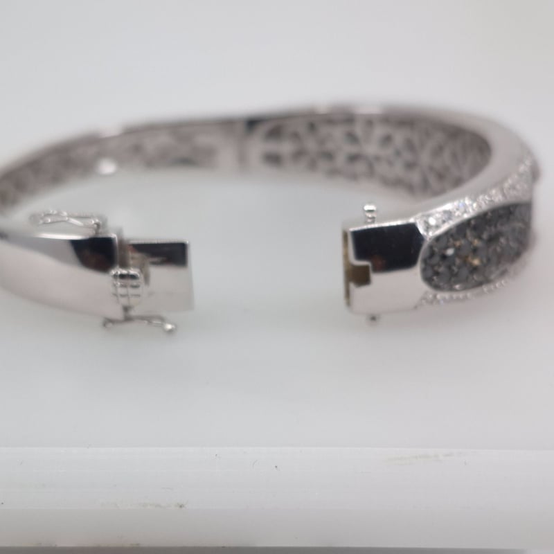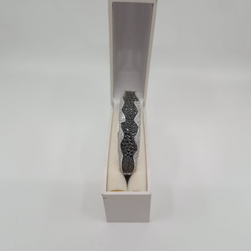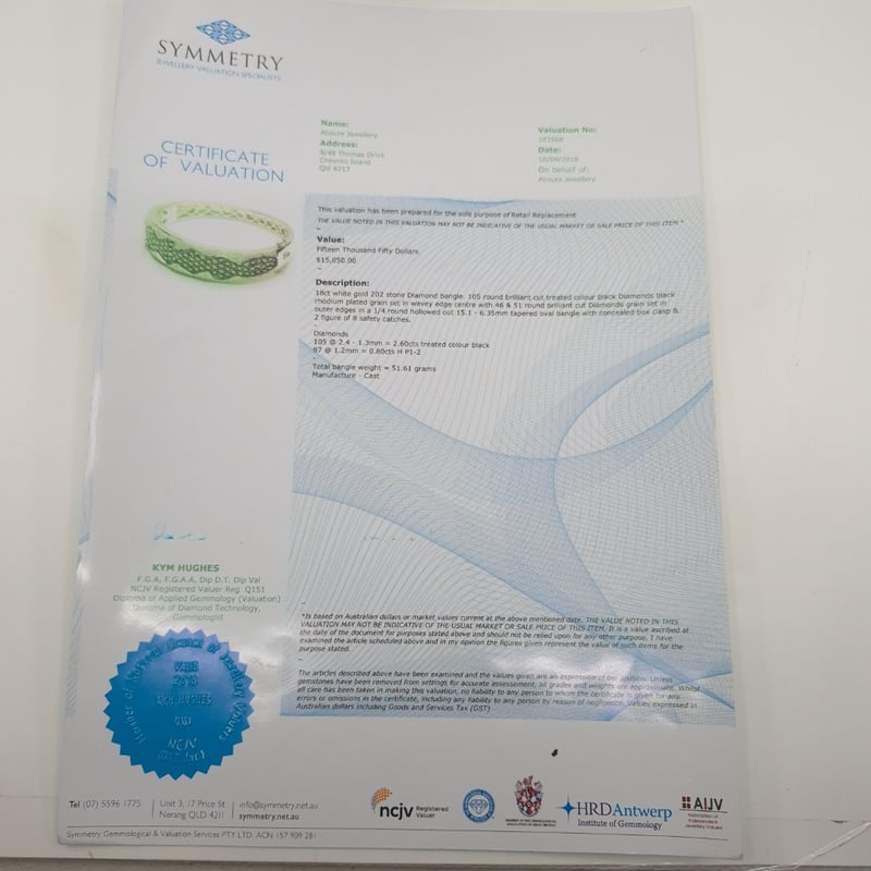 18CT WHITE GOLD 202 STONE DIAMOND BANGLE 105 Round Brilliant Cut Treated Colour Black Di Rhodium Plated Grain Set In Wavey Edge Centre With 46 & 51 Round Brilliant Cut Diamonds Outer Edges In A 1/4 Round Hollowed Out 15.16.35Mm Tapered Oval Bangle With Concea 2 Figure Of 8 Safety Catches. Total Item Weight: 51.61g Condition: Good - Refer To Images This valuation has been conducted by an independent third-party professional. The valuation amount is an assessment by the issuing valuer and does not reflect the auction value of the item. Any inquiries regarding the valuation should be directed to the issuing valuer (refer to contact details on the certificate), as Lloyds Auctions has no affiliation or influence over the valuation, the valuer, or the stated amount. Insurance Replacement Valuation Amount: $15,050.00 VAULT 586154+1