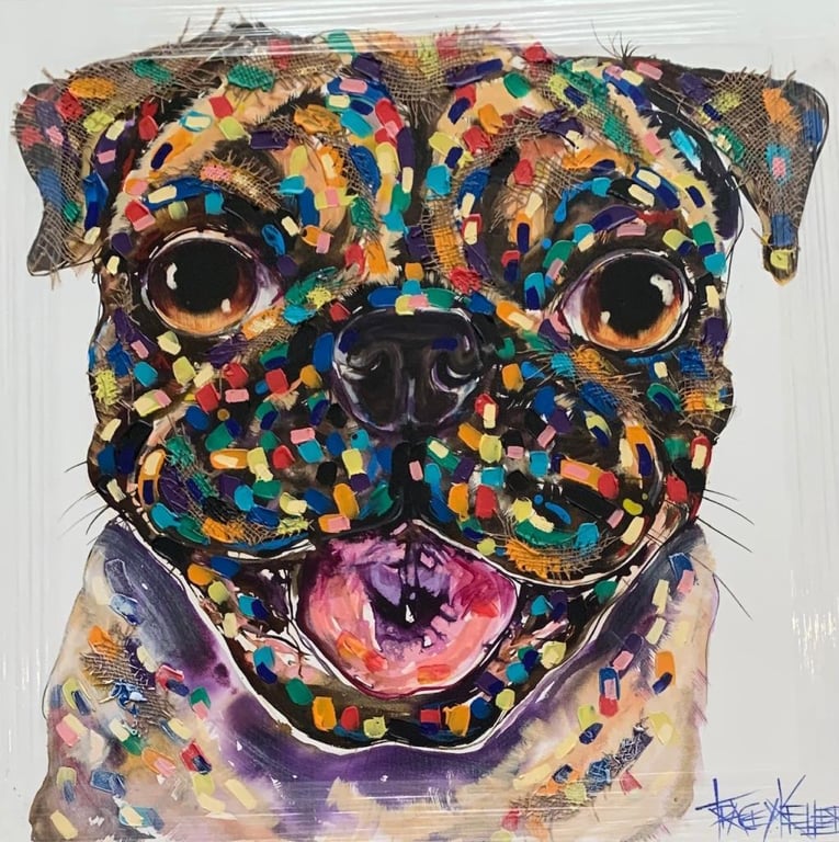 TRACEY KELLER (1967-) Title: PUGALICOIUS Original Acrylic, Hessian And Resin Painting On Canvas Framed Using A White Floating Frame Size: 95 x 4 x 95 Condition: Good - Refer To Images 488236+2