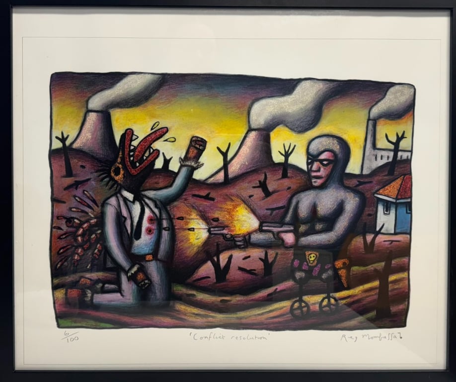 REG MOMBASSA AKA CHRIS O'DOHERTY (1951-)Original Coloured Offset Lithograph Ltd EditionedTitle: 'Conflict Resolution 'Image Size: 50cm x 34cmFrame Size: 63cm x 53cmEdition: 6/100Signature Details: Hand Signed By The Artist Below Image Titled & EditionedAccompanied By A Certificate Of AuthenticityCondition: Good - Refer To ImagesProvenance: Reg Needs Little Introduction, He Is An Icon Of The Art World. Reg Is One Of The Most Well Known Artists In Australia, He Was Known As The People'S Artist. His Art Is Not Only Purchased By Collectors But By Everday People Who Instantly Relate To,Mainly Known For Mambo,Mental As Anything,And Various Other Things Too Many To Mention.488235+7