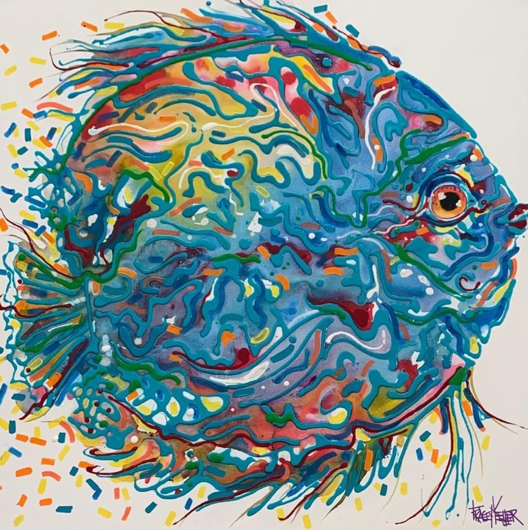 TRACEY KELLER (1967-) Title: BLUE DISCUS Original Acrylic & Resin Painting On Canvas Size: 90 x 3 x 90 Condition: Good - Refer To Images 488236+1