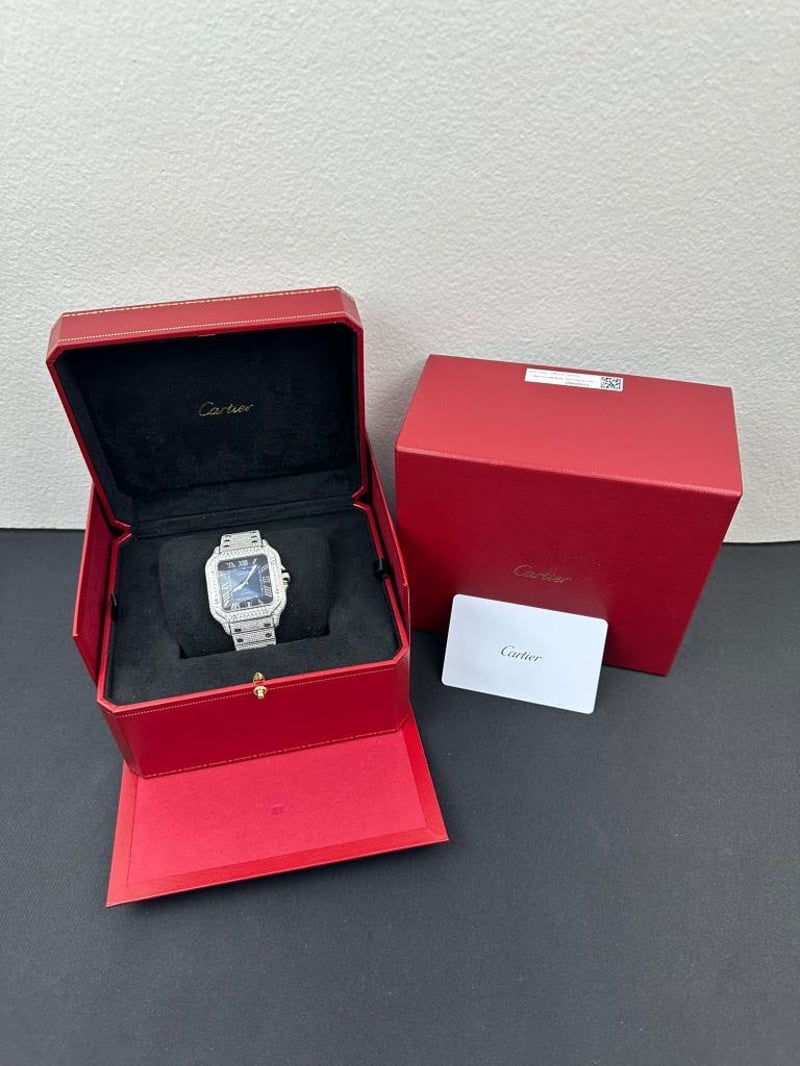 SANTOS DE CARTIER LARGE - CUSTOM DIAMOND NATURAL 2023 BXP WSSA0030 Brand: Cartier Model Number: SANTOS Reference Number: WSA0030 Production Year: 2023 Dial: BLUE Case: STAINLESS STEEL Case Size: 40MM Bracelet: STAINLESS STEEL Movement: AUTOMATIC Aftermarked Diamonds On Case And BraceletBox: YesPapers: Yes Condition: Good - Refer to Images