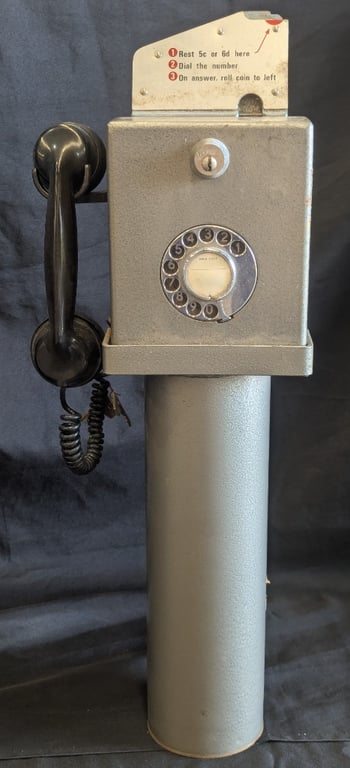 PILLAR STYLE PAYPHONE Metal Construction, Rotary Dial, Wired Handset, Handset Mount On Side, Includes Set Of Keys Item Size: 67cm H x 22cm W x 14cm D Condition: Very Good