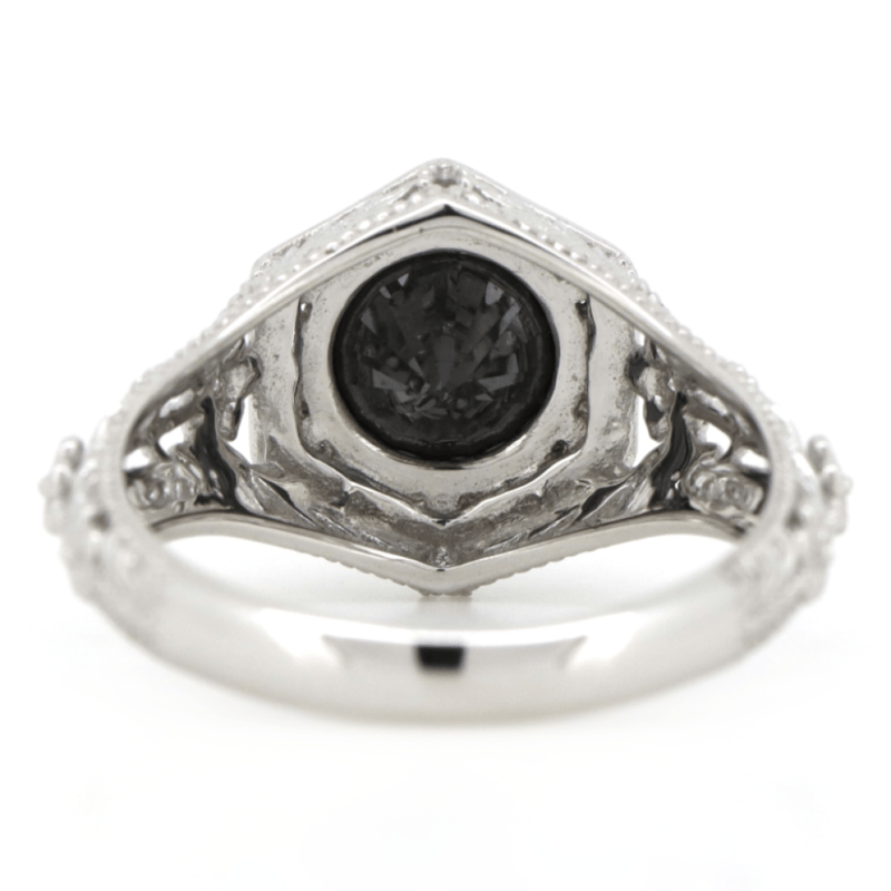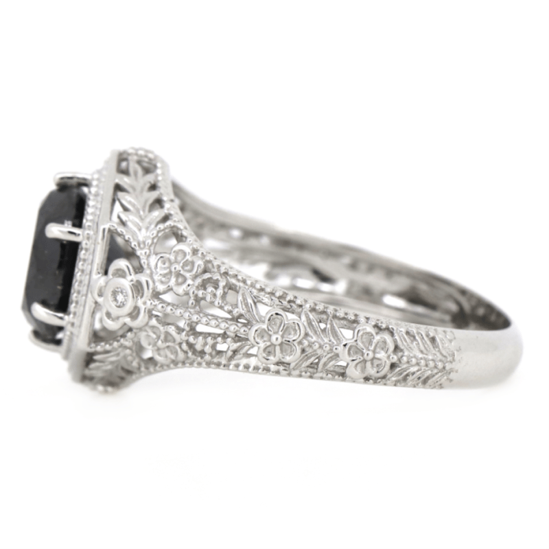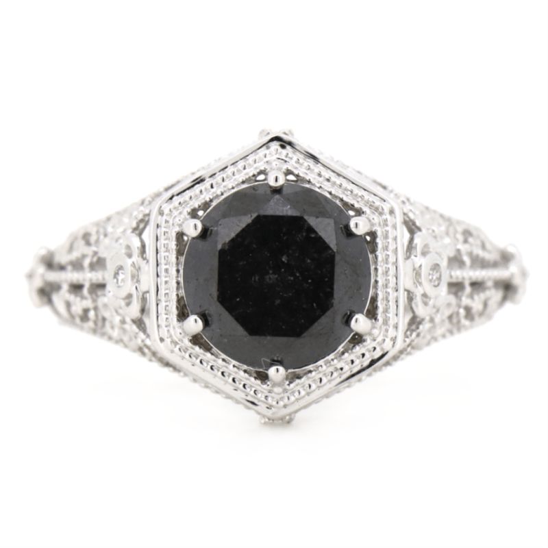 The Centre Features, One Round Brilliant Cut, Black, Diamond (2.15Ct, Opaque), 6 Claw Set. Decorating The Shoulders Are, 2 Round Brilliant Cut, Diamonds (0.01Ct Tdw, H Colour, Si Clarity), Bezel Set. The Band Is Decorated With Elaborate Floral Designs. Ring Size M.