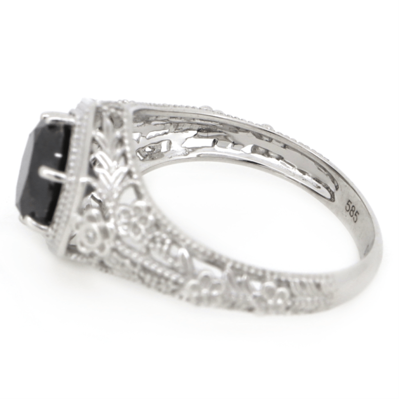 14K WHITE GOLD, BLACK DIAMOND, ART DECO INSPIRED RING.