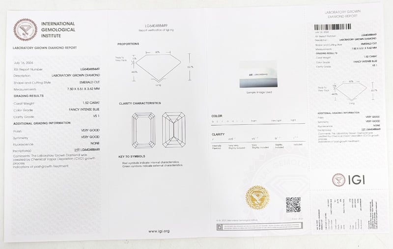1.52CT IGI CERTIFIED BLUE LAB GROWN DIAMOND Shape And Cutting Style: Emerald Cut Colour Grade: Fancy Intense Blue Clarity Grade: Vs 1 Polish: Very Good Symmetry: Very Good Dimensions: Height: 7.50mm, Width: 5.51mm, Depth: 3.62mm 584109+4