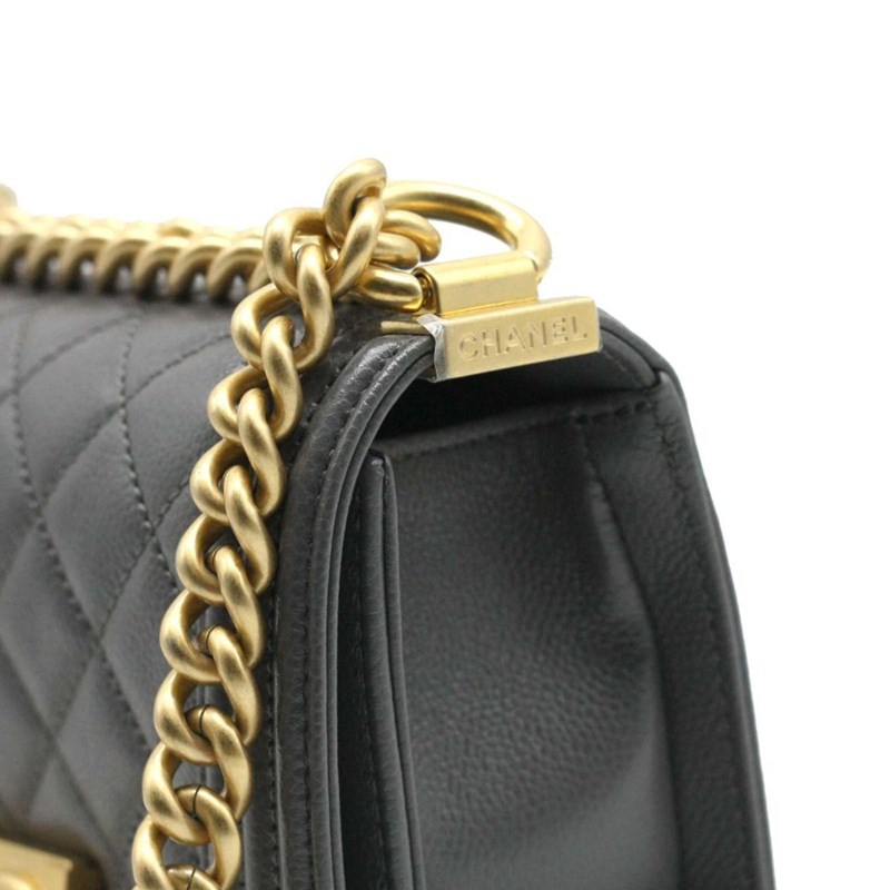 Quilted caviar leather with gold-tone hardware, push-lock closure and a shoulder strap.