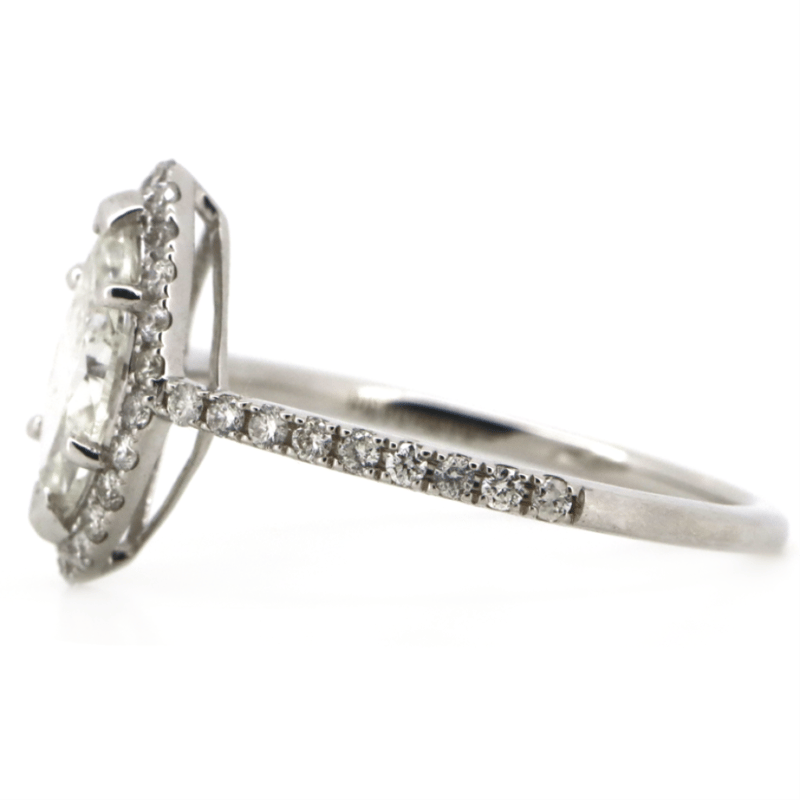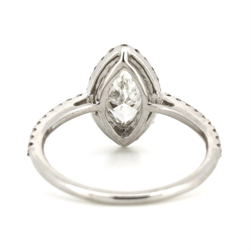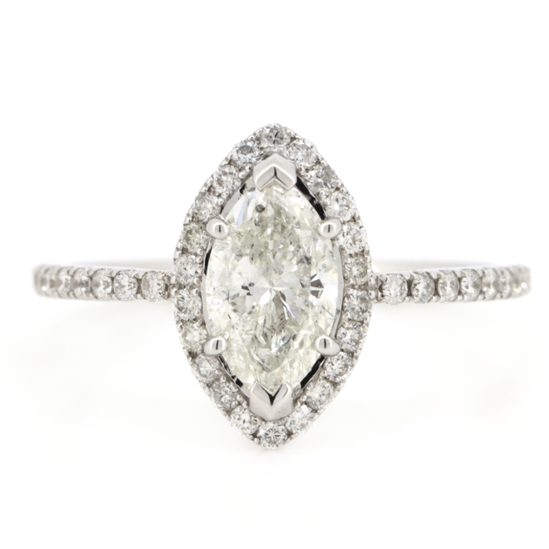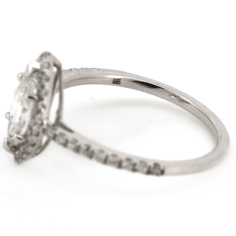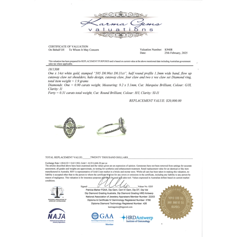 14K WHITE GOLD AND DIAMOND, HALO RING. The Centre Features, One Marquise Brilliant Cut, Diamond (0.90Ct, G-H Colour, I1 Clarity), Claw Set. Surrounding The Centre In A Halo And Decorating The Band Are, 40 Round Brilliant Cut, Diamonds (0.31Ct Tdw, H-I Colour, Si-I1 Clarity), Claw Set. Ring Size N 1/2. Valuations Provided by an Independent Third-Party Professional Not Directly Associated With Lloyds Auctions at AUD $$20,000.00 This valuation has been conducted by an independent third-party professional. The valuation amount is an assessment by the issuing valuer and does not reflect the auction value of the item. Any inquiries regarding the valuation should be directed to the issuing valuer (refer to contact details on the certificate), as Lloyds Auctions has no affiliation or influence over the valuation, the valuer, or the stated amount. Condition: Good - Refer Images 0 645844+5046