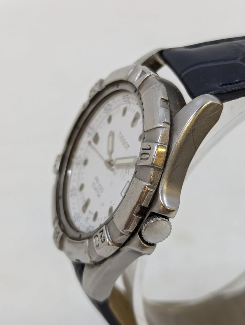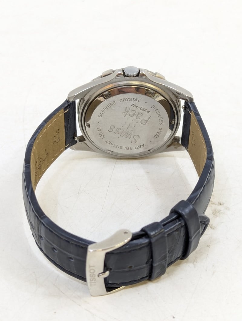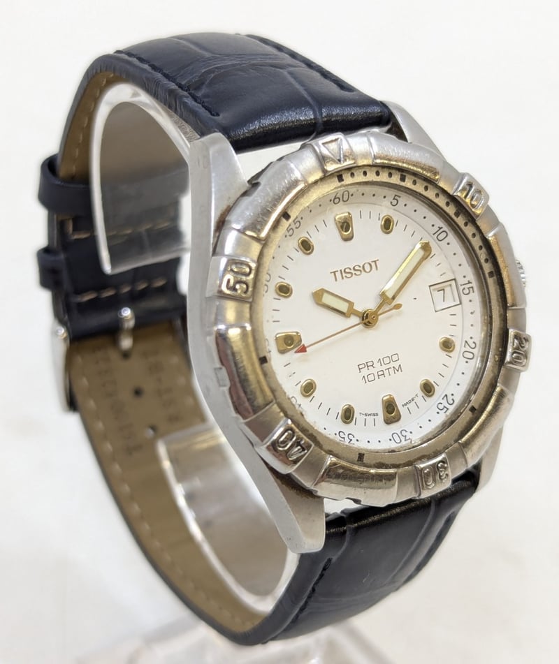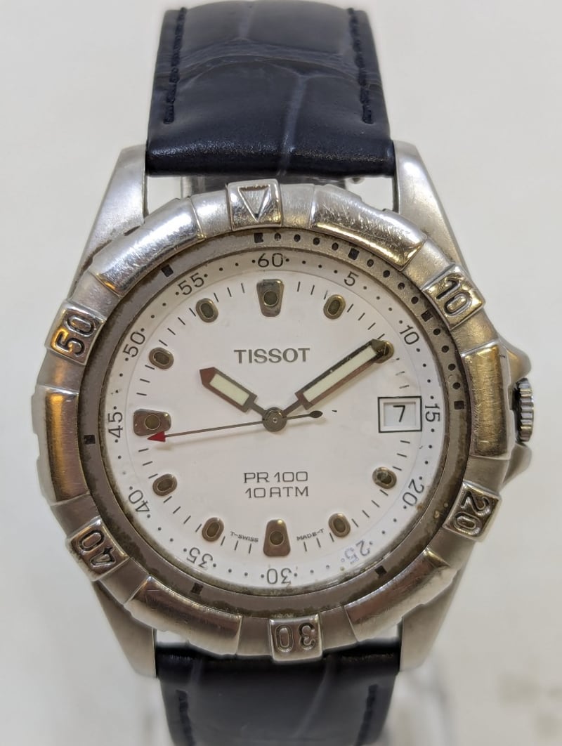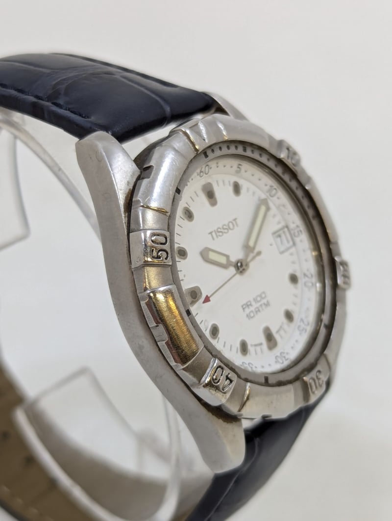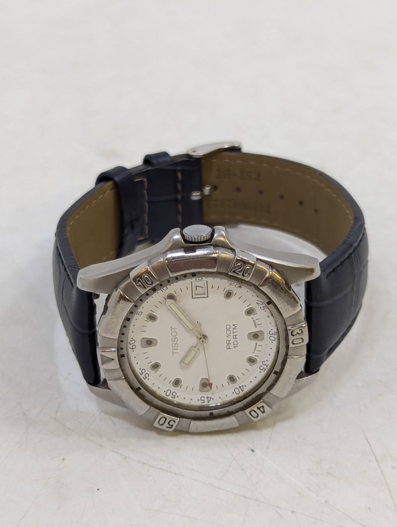 TISSOT PR 100 CASE DESCRIPTION: STAINLESS STEELCASE SIZE: 40MMBRACELET: LEATHER STYLEBOX: NOT INCLUDEDPAPERS: NOT INCLUDEDAdditional Information: White DialNon Numerical Hour MarkerDate Display At 3 O'Clock PositionLuminous HandsBuckle ClaspWater Resistant: 10 AtmMovement Untested584956+13