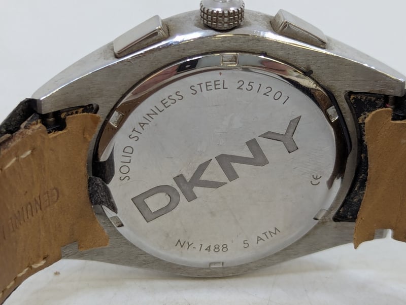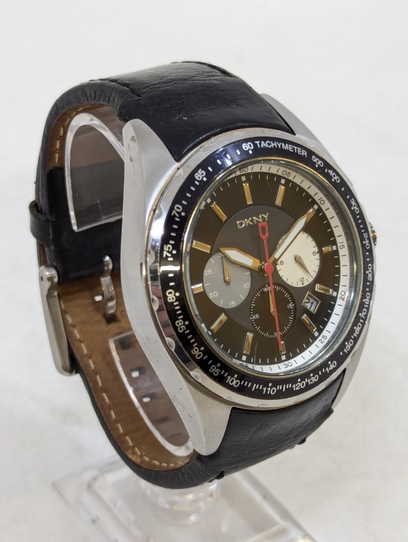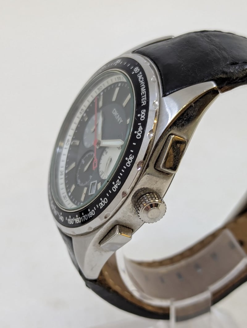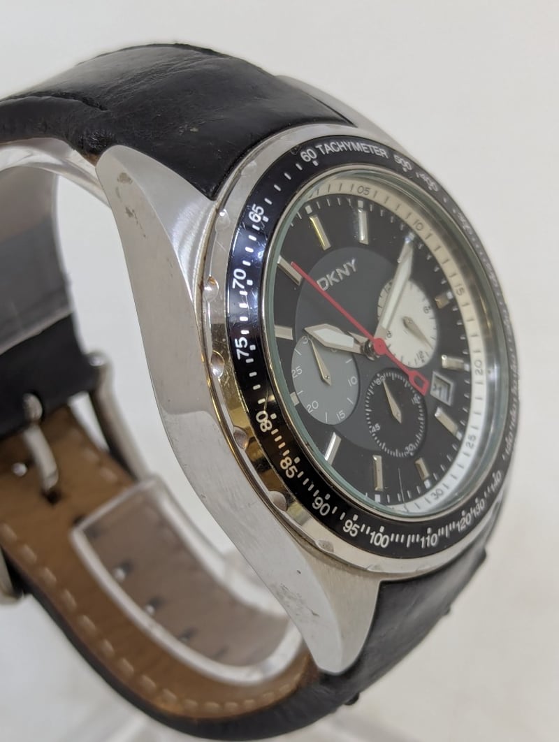 DKNY CHRONOGRAPH TACYMETER CASE DESCRIPTION: STAINLESS STEELCASE SIZE: 46MMBRACELET: LEATHER BRACELETBOX: NOT INCLUDEDPAPERS: NOT INCLUDEDAdditional Information: Black DialNon Numerical Hour Markers3X ChronographDate Display At 4:30 PositionBuckle ClaspMovement Untested584956+14