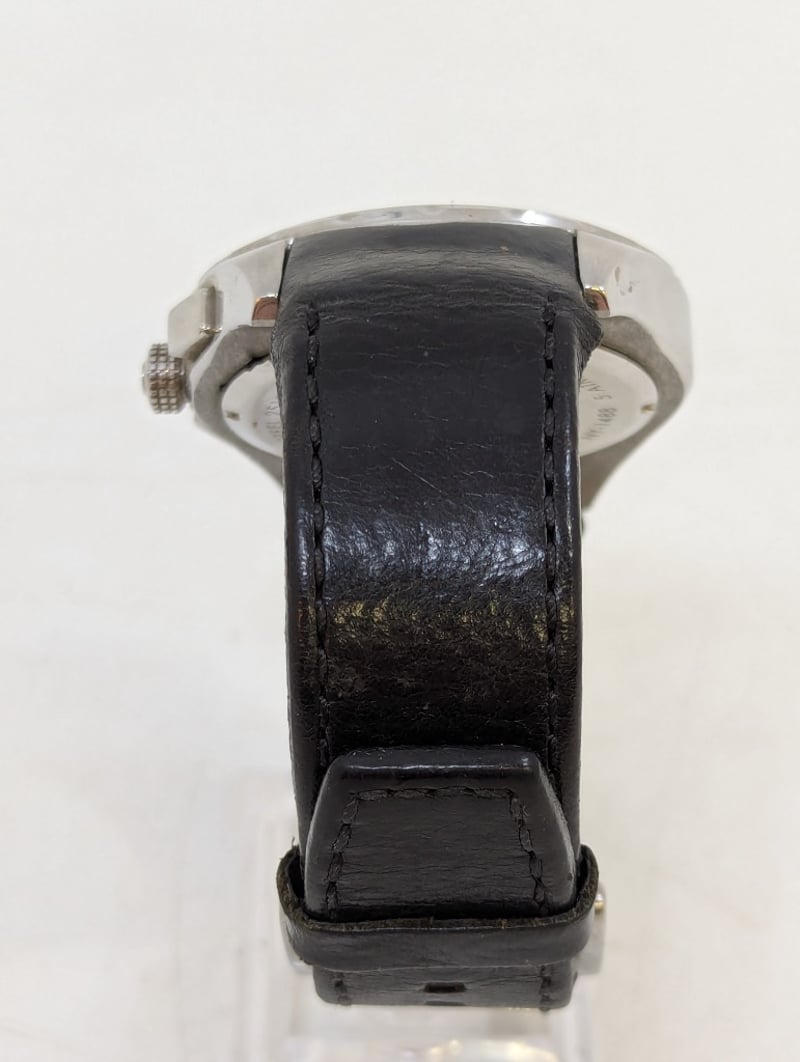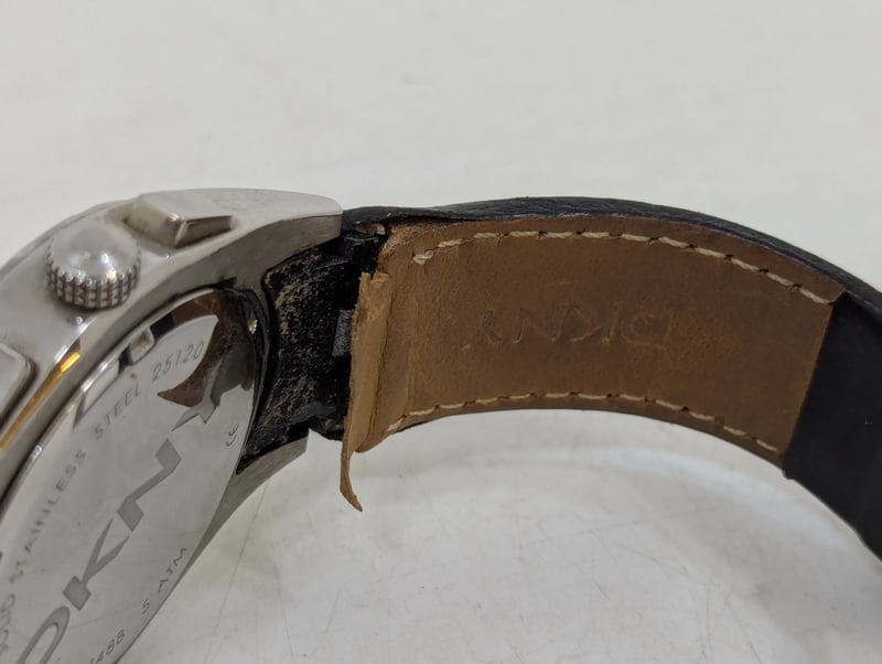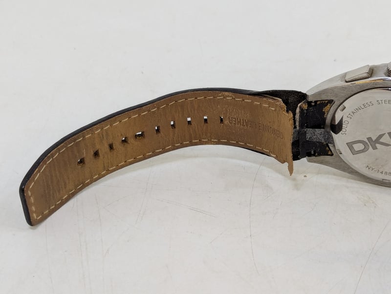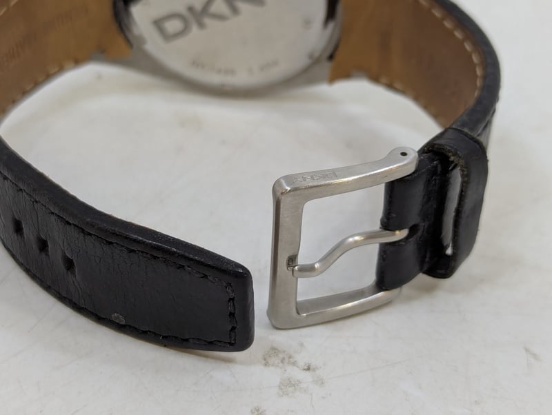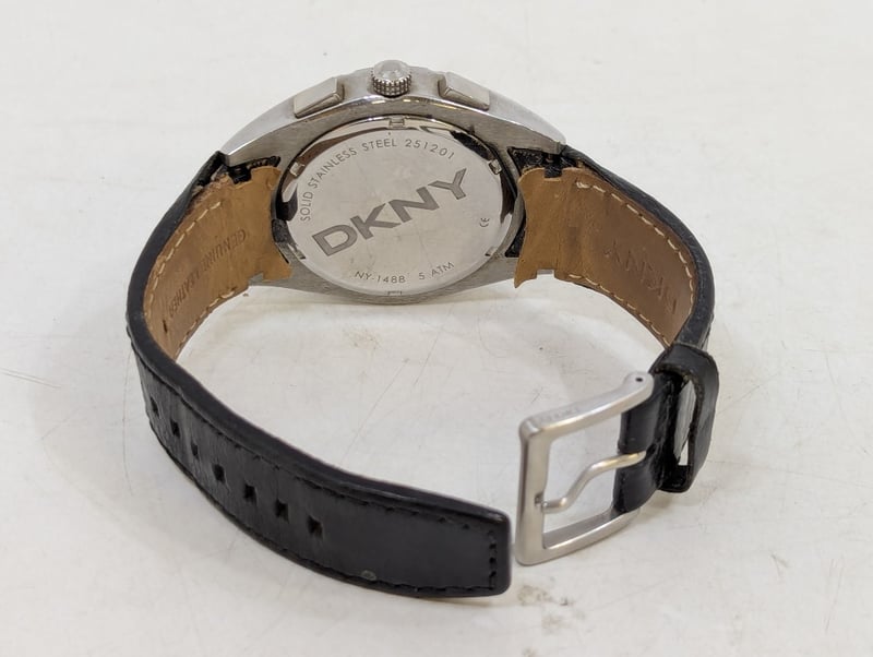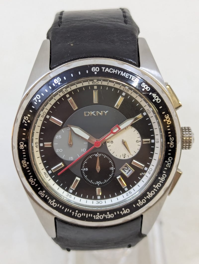 DKNY CHRONOGRAPH TACYMETER CASE DESCRIPTION: STAINLESS STEELCASE SIZE: 46MMBRACELET: LEATHER BRACELETBOX: NOT INCLUDEDPAPERS: NOT INCLUDEDAdditional Information: Black DialNon Numerical Hour Markers3X ChronographDate Display At 4:30 PositionBuckle ClaspMovement Untested584956+14