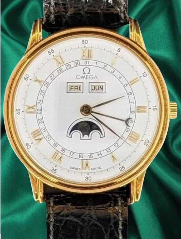 OMEGA 18CT GOLD MOONPHASE 1980 Price Guide - $8,000 - $10,000 PRODUCTION YEAR: 1980 DIAL: WHITE CASE DESCRIPTION: 18CT YELLOW GOLD CASE SIZE: 340MM BRACELET: LEATHER, BUCKLE CLASP MOVEMENT: AUTOMATIC BOX: NOT INCLUDED PAPERS: NOT INCLUDED Condition: Used - Refer Images Additional Information: Serial #3703*** SR
