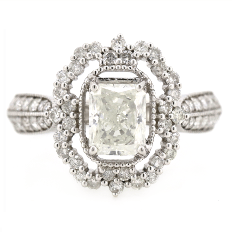 14K WHITE GOLD, DIAMOND, DRESS RING. The Centre Features, One Emerald Radiant Cut, Diamond (1.01Ct, H-I Colour, Clarity), Claw Set. Decorating The Setting And The Band Are, 56 Round Brilliant Cut, Diamonds (0.57Ct Tdw, G-H Colour, Si1-Clarity), Bead Set With Millegrain Detail. Ring Size M. Valuations Provided by an Independent Third-Party Professional Not Directly Associated With Lloyds Auctions at AUD $$23,200.00This valuation has been conducted by an independent third-party professional. The valuation amount is an assessment by the issuing valuer and does not reflect the auction value of the item. Any inquiries regarding the valuation should be directed to the issuing valuer (refer to contact details on the certificate), as Lloyds Auctions has no affiliation or influence over the valuation, the valuer, or the stated amount. Condition: Good - Refer Images 0645829+3319