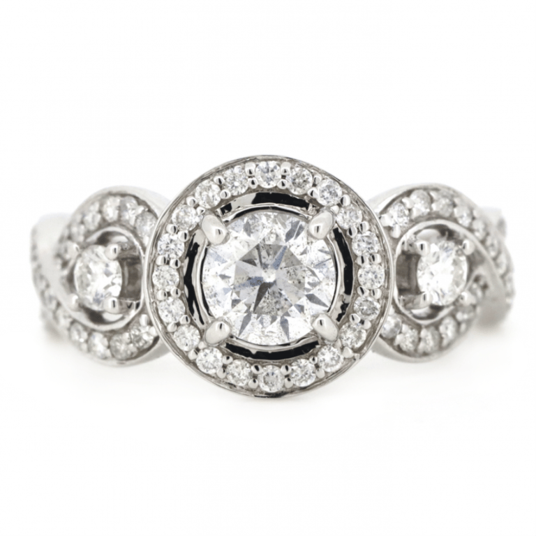 14K WHITE GOLD AND DIAMOND, HALO TRILOGY RING. The Centre Features, One Round Brilliant Cut, Diamond (0.71Ct, H-J Colour, Si1-Si2 Clarity), 4 Claw Set. Accompanying The Centre Are, 2 Round Brilliant Cut, Diamonds (0.15Ct Tdw, I Colour, Si1-P1 Clarity), Claw Set. Surrounding The Stones In Infinity Design Halos Are, 68 Round Brilliant Cut, Diamonds (0.42Ct Tdw, G-H Colour, Si1-Si2 Clarity), Bead/Claw Set. Ring Size M 1/2. Valuations Provided by an Independent Third-Party Professional Not Directly Associated With Lloyds Auctions at AUD $$20,000.00This valuation has been conducted by an independent third-party professional. The valuation amount is an assessment by the issuing valuer and does not reflect the auction value of the item. Any inquiries regarding the valuation should be directed to the issuing valuer (refer to contact details on the certificate), as Lloyds Auctions has no affiliation or influence over the valuation, the valuer, or the stated amount. Condition: Good - Refer Images 0645829+3400