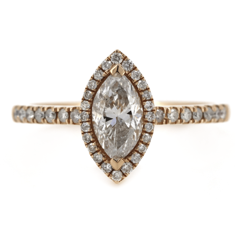 14K ROSE GOLD AND DIAMOND, HALO RING. The Centre Features, One Marquise Cut, Diamond (0.75Ct, I-J Colour, Si2-P1, Clarity), 2 Corner Claw Set. Surrounding The Centre In A Halo And Decorating The Band Are, 36 Round Brilliant Cut, Diamonds (0.21Ct Tdw, I-K Colour, P1-P2 Clarity), Claw Set. Ring Size M 1/2. Valuations Provided by an Independent Third-Party Professional Not Directly Associated With Lloyds Auctions at AUD $$18,700.00This valuation has been conducted by an independent third-party professional. The valuation amount is an assessment by the issuing valuer and does not reflect the auction value of the item. Any inquiries regarding the valuation should be directed to the issuing valuer (refer to contact details on the certificate), as Lloyds Auctions has no affiliation or influence over the valuation, the valuer, or the stated amount. Condition: Good - Refer Images 0645829+3361