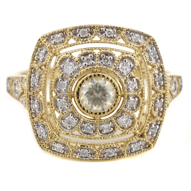 14K YELLOW GOLD AND DIAMOND, ANTIQUE INSPIRED RING.
