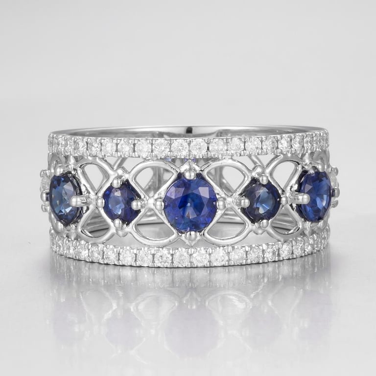 14CT WHITE GOLD AUSTRALIAN SAPPHIRE AND DIAMOND DRESS RING. Featuring Centre, 5 Round Cut, Deep Moderate Blue Australian Sapphires (1.35Ct Tsw, Moderately Included), Claw Set, With 50 Round Brilliant Cut Diamonds (0.48Ct Tdw, G-H Colour, Vs2 Clarity), Bead Set. Ring Size O. Valuations Provided by an Independent Third-Party Professional Not Directly Associated With Lloyds Auctions at AUD $22000This valuation has been conducted by an independent third-party professional. The valuation amount is an assessment by the issuing valuer and does not reflect the auction value of the item. Any inquiries regarding the valuation should be directed to the issuing valuer (refer to contact details on the certificate), as Lloyds Auctions has no affiliation or influence over the valuation, the valuer, or the stated amount. Condition: Good - Refer Images 0587673+424