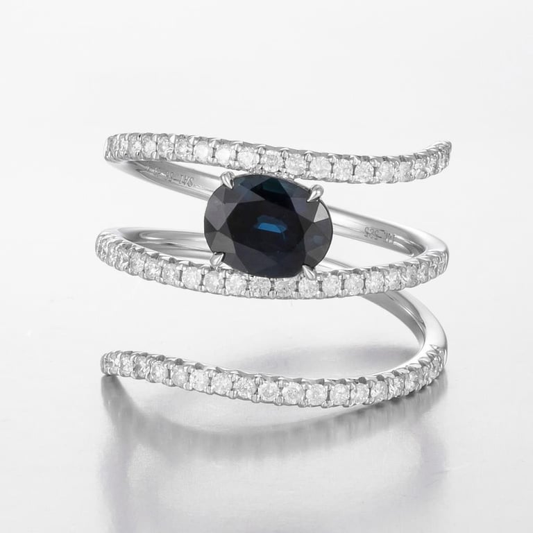 14CT WHITE GOLD AUSTRALIAN SAPPHIRE AND DIAMOND SPIRAL DRESS RING . Featuring Centre, One Oval Cut, Deep Blue/Black Australian Sapphire (1.56Ct, Heavily Included), Claw Set, With 63 Round Brilliant Cut Diamonds (0.49Ct Tdw, F-G Colour, Vs2 Clarity), Pip Claw Set. Ring Size O. Valuations Provided by an Independent Third-Party Professional Not Directly Associated With Lloyds Auctions at AUD $19000This valuation has been conducted by an independent third-party professional. The valuation amount is an assessment by the issuing valuer and does not reflect the auction value of the item. Any inquiries regarding the valuation should be directed to the issuing valuer (refer to contact details on the certificate), as Lloyds Auctions has no affiliation or influence over the valuation, the valuer, or the stated amount. Condition: Good - Refer Images 0587673+426