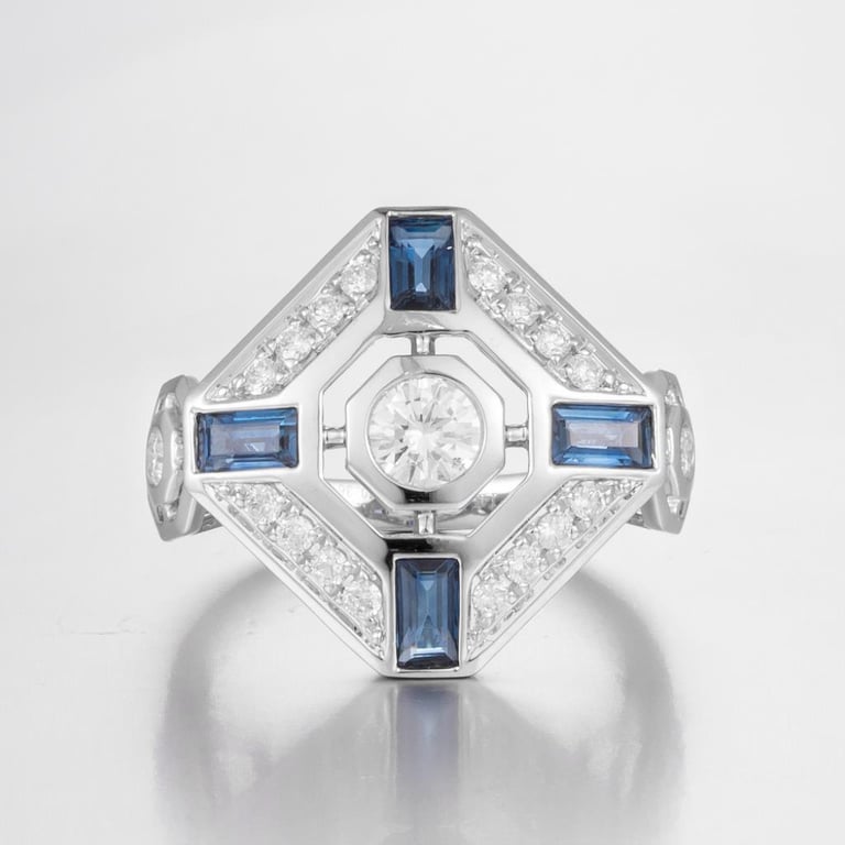 14CT WHITE GOLD CEYLON SAPPHIRE AND DIAMOND ART DECO INSPIRED RING . Featuring Centre, One Round Brilliant Cut Diamond (0.33Ct, G Colour, Vs2 Clarity), Bezel Set, With 4 Rectangular Step Cut, Dark Vivid Blue Ceylon Sapphires (1.02Ct Tsw, Eye Clean), Bezel Set, And 18 Round Brilliant Cut Diamonds (0.36Ct Tdw, G-H Colour, Si1-Si2 Clarity), Bead Set. Ring Size O. Valuations Provided by an Independent Third-Party Professional Not Directly Associated With Lloyds Auctions at AUD $30500This valuation has been conducted by an independent third-party professional. The valuation amount is an assessment by the issuing valuer and does not reflect the auction value of the item. Any inquiries regarding the valuation should be directed to the issuing valuer (refer to contact details on the certificate), as Lloyds Auctions has no affiliation or influence over the valuation, the valuer, or the stated amount. Condition: Good - Refer Images 0587673+427
