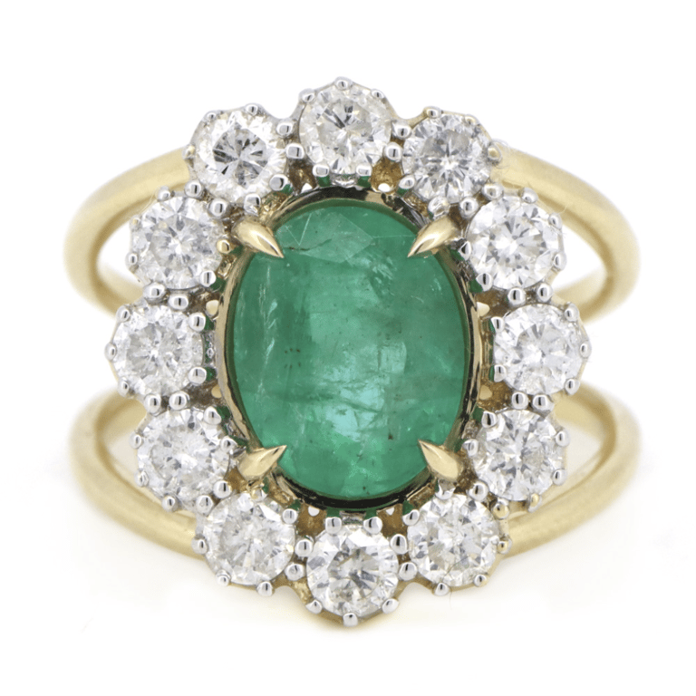 14K YELLOW GOLD, EMERALD AND DIAMOND, HALO SPLIT BAND RING. The Centre Features, One Oval Mixed Cut, Deep Vivid Blue Green, Emerald (2.01Ct, Heavily Included), 4 Claw Set. Surrounding The Centre Are, 12 Round Brilliant Cut, Diamonds (1.41Ct Tdw, G-H Colour, Si1-Si2 Clarity), Bead Set In White Gold. Ring Size N 1/2. Valuations Provided by an Independent Third-Party Professional Not Directly Associated With Lloyds Auctions at AUD $$30,000.00This valuation has been conducted by an independent third-party professional. The valuation amount is an assessment by the issuing valuer and does not reflect the auction value of the item. Any inquiries regarding the valuation should be directed to the issuing valuer (refer to contact details on the certificate), as Lloyds Auctions has no affiliation or influence over the valuation, the valuer, or the stated amount. Condition: Good - Refer Images 0645832+5264