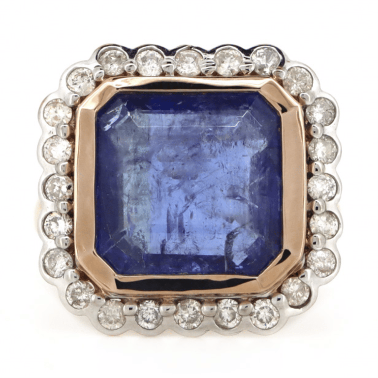 14K ROSE GOLD, 11.19CT TANZANITE AND DIAMOND, STATEMENT RING. The Centre Features, One Cushion Cut, Moderate Vivid-Blue, Tanzanite (11.19Ct, Moderate Natural Inclusions), Bezel Set. Surrounding The Centre In A Halo Are, 24 Round Brilliant Cut, Diamonds (0.68Ct Tdw, G-H Colour, Si2-P1 Clarity), Semi-Bezel/Bead Set In White Gold. Ring Size: N 1/2. Valuations Provided by an Independent Third-Party Professional Not Directly Associated With Lloyds Auctions at AUD $$20,000.00This valuation has been conducted by an independent third-party professional. The valuation amount is an assessment by the issuing valuer and does not reflect the auction value of the item. Any inquiries regarding the valuation should be directed to the issuing valuer (refer to contact details on the certificate), as Lloyds Auctions has no affiliation or influence over the valuation, the valuer, or the stated amount. Condition: Good - Refer Images 0645832+5292
