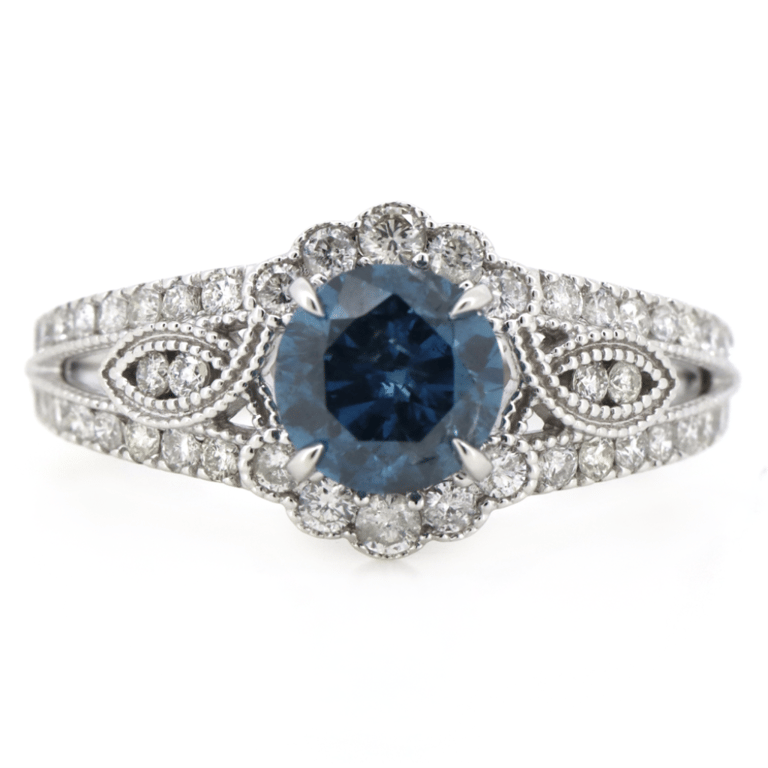 14K WHITE GOLD, FANCY BLUE DIAMOND AND DIAMOND, VINTAGE INSPIRED RING. The Centre Features, One Round Brilliant Cut, Fancy Vivid Blue, Diamond (1.00Ct, Si2 Clarity, Hpht Enhanced), Claw Set. Encompassing The Design Are, 50 Round Brilliant Cut, Diamonds (0.57Ct Tdw, G-H Colour, Si2-P1 Clarity), Bezel/Pip-Claw Set With Millegrain Detail. Ring Size M 1/2. Valuations Provided by an Independent Third-Party Professional Not Directly Associated With Lloyds Auctions at AUD $$24,000.00This valuation has been conducted by an independent third-party professional. The valuation amount is an assessment by the issuing valuer and does not reflect the auction value of the item. Any inquiries regarding the valuation should be directed to the issuing valuer (refer to contact details on the certificate), as Lloyds Auctions has no affiliation or influence over the valuation, the valuer, or the stated amount. Condition: Good - Refer Images 0645832+5258