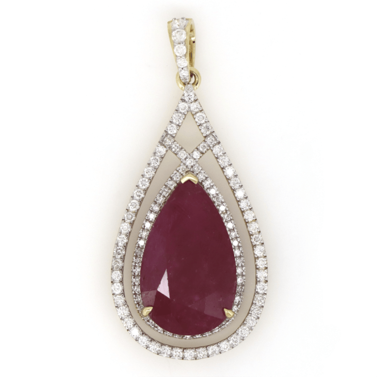 The Centre Features, One Pear Cut, Deep Moderate Red, Ruby (11.34Ct, Moderately Included), 3 Claw Basket Set. Encompassing The Centre Are, 107 Round Brilliant Cut, Diamonds (0.83Ct Tdw, G-H Colour, Si1-Si2 Clarity), Bead Set.