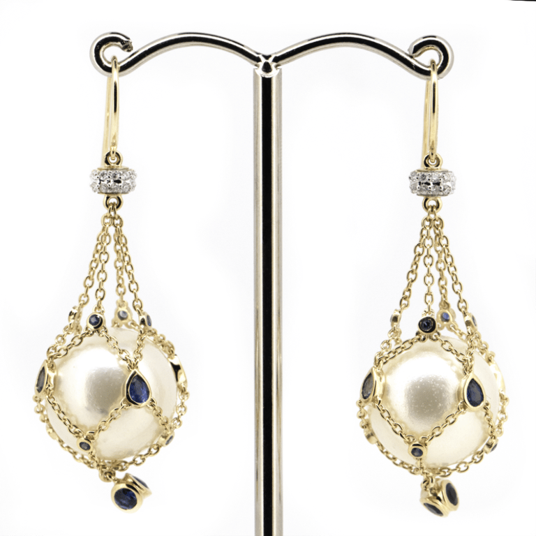 14K YELLOW GOLD, WHITE CULTURED SOUTH SEA PEARL, BLUE SAPPHIRE AND DIAMOND, CAGE EARRINGS. The Design Features, 2 Round Circle, White With Silver Overtones, Cultured South Sea Pearls (39.40Ct Tsw/14.00Mm Size, Good Lustre), Unset -Cage Set. Decorating The Cage Setting Are, 30 Pear/Round Cut, Blue Sapphires (1.23Ct Tsw, Slightly Included) And 40 Round Brilliant Cut, Diamonds (0.20Ct Tdw, G-H Colour, Si1-Si2 Clarity), Bezel/Bead Set. The Earrings Feature, Shepherd Hooks. Valuations Provided by an Independent Third-Party Professional Not Directly Associated With Lloyds Auctions at AUD $$28,000.00This valuation has been conducted by an independent third-party professional. The valuation amount is an assessment by the issuing valuer and does not reflect the auction value of the item. Any inquiries regarding the valuation should be directed to the issuing valuer (refer to contact details on the certificate), as Lloyds Auctions has no affiliation or influence over the valuation, the valuer, or the stated amount. Condition: Good - Refer Images 0645832+5254