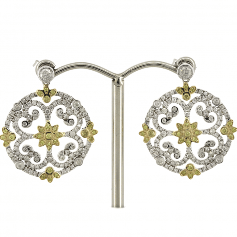 14K WHITE/YELLOW GOLD, FANCY YELLOW DIAMOND, ANTIQUE INSPIRED EARRINGS.