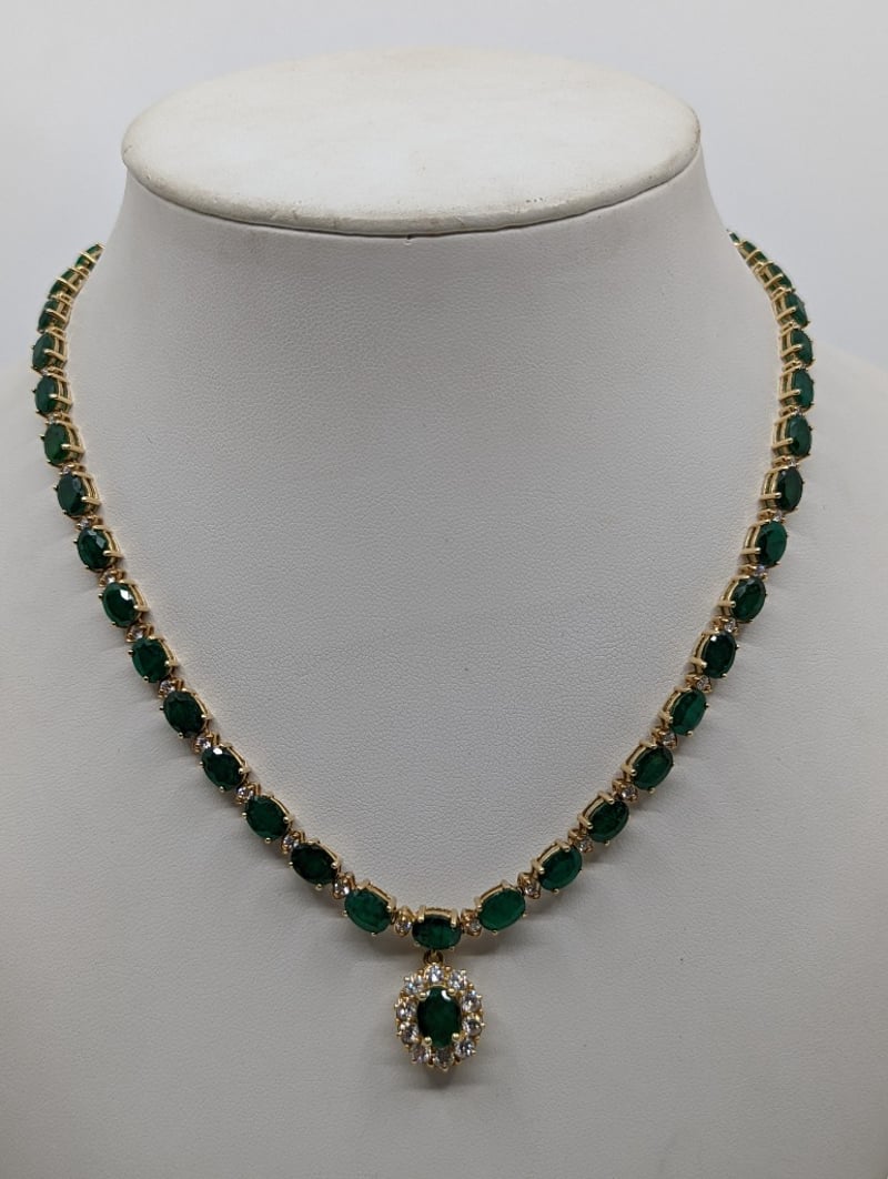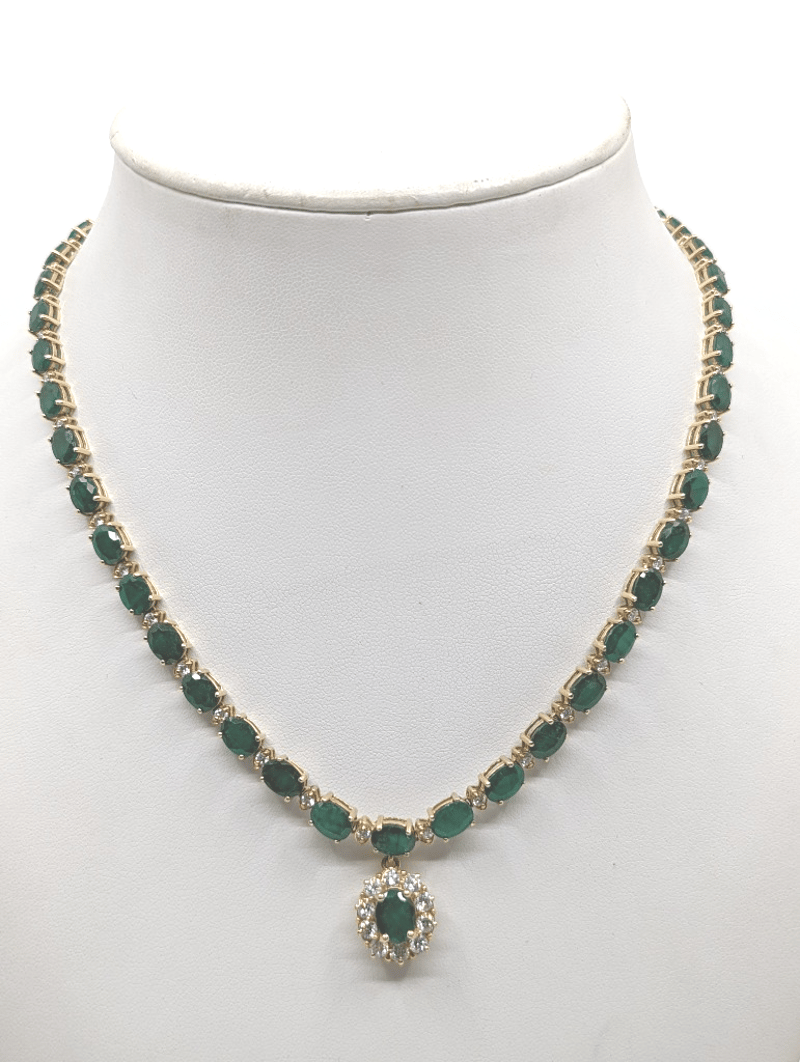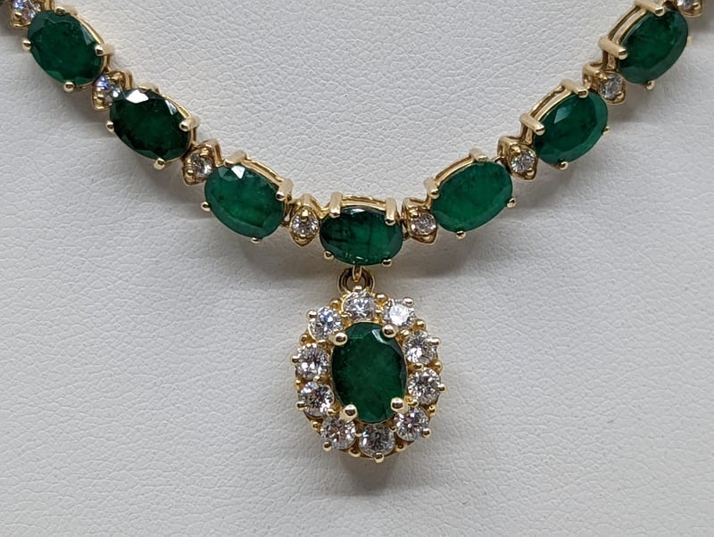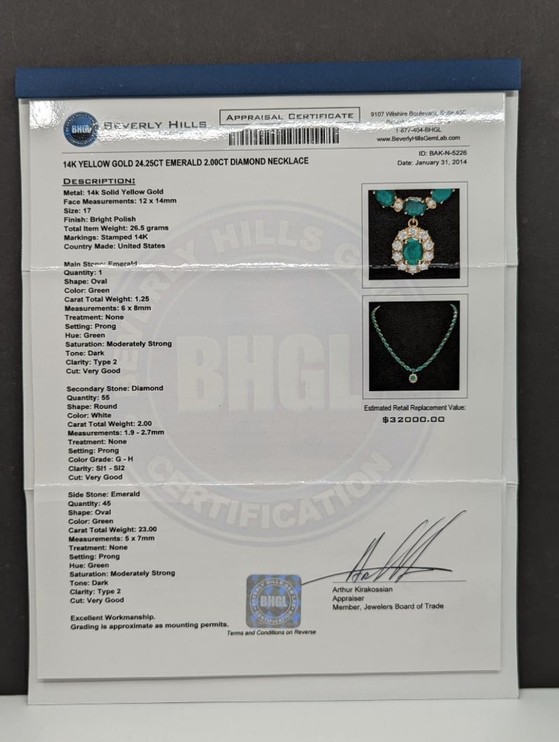 14K YELLOW GOLD EMERALD AND DIAMOND NECKLACEFeaturing A Pendant With A 1.25Ct Oval Cut Emerald Surrounded By 2.00Tcw Round Cut Diamonds. The Necklace Comprises Oval Cut Emeralds And Round Cut Diamonds In Yellow Gold FrameCondition: Used - Refer ImagesThis Insurance Valuation Has Been Provided By A Registered Jewellery Valuer And Is Intended For Insurance Purposes Only. The Valuation Amount Has No Bearing On The Auction Value Of The Item. Any Questions Regarding The Valuation Should Be Directed To The Issuing Valuer (Refer To ContTotal Item Weight: 26.50gCondition: Good - Refer To ImagesThis valuation has been conducted by an independent third-party professional. The valuation amount is an assessment by the issuing valuer and does not reflect the auction value of the item.Any inquiries regarding the valuation should be directed to the issuing valuer (refer to contact details on the certificate), as Lloyds Auctions has no affiliation or influence over the valuation, the valuer, or the stated amount.Insurance Replacement Valuation Amount: $32,000.00VAULT586187+1