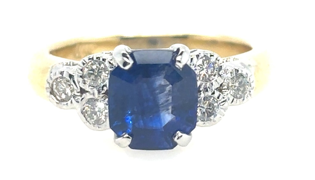 18CT YELLOW AND WHITE GOLD ART DECO SAPPHIRE AND DIAMOND RING