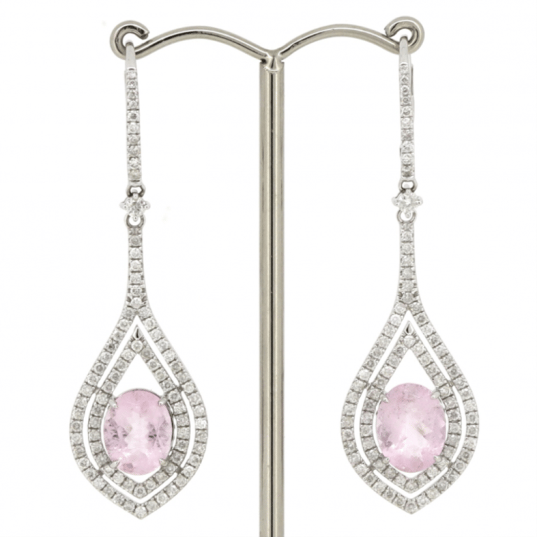 The Design Features, 2 Oval Cut, Moderate Pale Pink, Morganites (5.43Ct Tsw, Slightly-Moderately Included), Claw Set. Accompanying The Design Are, 124 Round Brilliant Cut, Diamonds (1.89Ct Tdw, G-K Colour, P1 Clarity), Bead Set. The Earrings Have Shepard Hook Spring Backs.