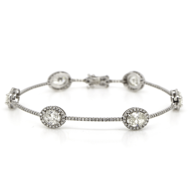 14K WHITE GOLD, 7.28CT TDW DIAMOND, HALO BRACELET. The Design Features, 6 Oval Modified Brilliant Cut, Diamonds (6.02Ct Tdw, H-K Colour, Si1-P1 Clarity), 4 Claw Set. Surrounding The Diamonds And Decorating The Band Are, 207 Round Brilliant Cut, Diamonds (1.26Ct Tdw, G-H Colour, Vsi-Si1 Clarity), Pip-Claw Set. The Bracelet Features A Box Snap Closure With Double Figure '8' Safety Latch. Bracelet Length Is 18Cm. Valuations Provided by an Independent Third-Party Professional Not Directly Associated With Lloyds Auctions at AUD $$128,000.00This valuation has been conducted by an independent third-party professional. The valuation amount is an assessment by the issuing valuer and does not reflect the auction value of the item. Any inquiries regarding the valuation should be directed to the issuing valuer (refer to contact details on the certificate), as Lloyds Auctions has no affiliation or influence over the valuation, the valuer, or the stated amount. Condition: Good - Refer Images 0645832+5270