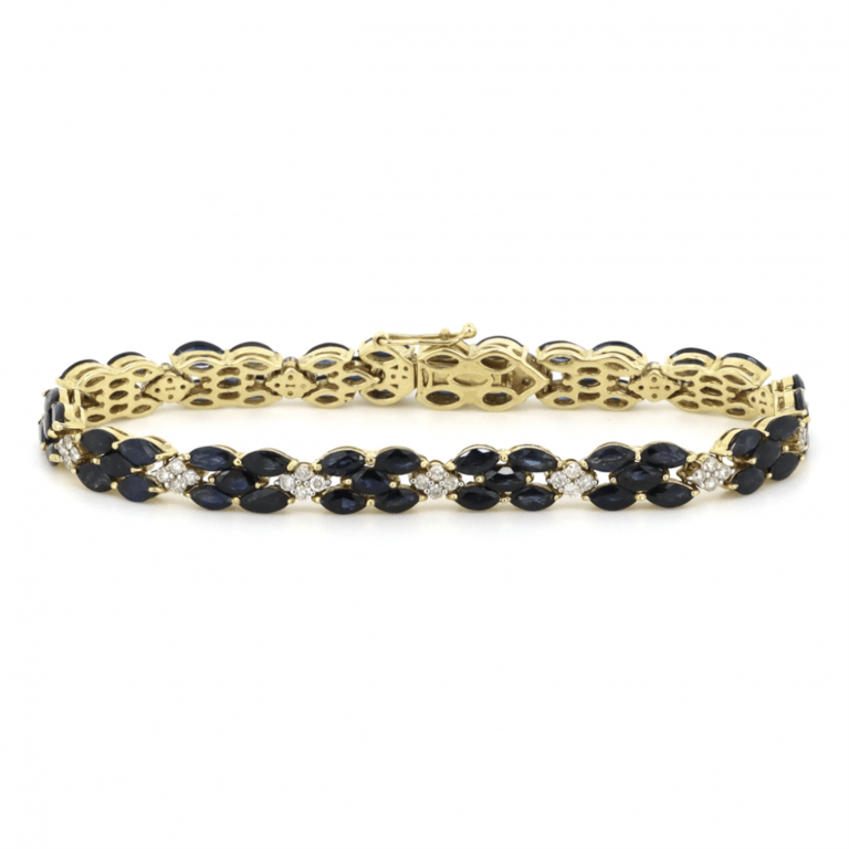 14K YELLOW GOLD, BLUE SAPPHIRE AND DIAMOND, DECORATIVE LINE BRACELET. The Bracelet Features, 70 Marquise Cut, Royal Blue, Sapphires (13.36Ct Tsw, Eye Clean Clarity), Claw Set. Alternating Between Sections Are, 56 Round Brilliant Cut, Diamonds (1.01Ct Tdw, H-J Colour, Si2-I2 Clarity), Shared Claw Set In White Gold. The Bracelet Has A Box Lock Clasp With One Figure '8' Safety Latch. Bracelet Length Is 18Cm. Valuations Provided by an Independent Third-Party Professional Not Directly Associated With Lloyds Auctions at AUD $$22,390.00This valuation has been conducted by an independent third-party professional. The valuation amount is an assessment by the issuing valuer and does not reflect the auction value of the item. Any inquiries regarding the valuation should be directed to the issuing valuer (refer to contact details on the certificate), as Lloyds Auctions has no affiliation or influence over the valuation, the valuer, or the stated amount. Condition: Good - Refer Images 0645832+5294