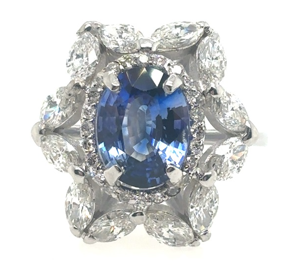 18CT WHITE GOLD SAPPHIRE AND DIAMOND RINGFeaturing Oval Cut Sapphire, Claw Set, 1.99Ct In Weight (9.03 X 6.97 X 3.83 Mm), Blue In Colour As Per Aig Report Number Gem20250225133076. 12 Marquise Cut Diamonds And 24 Round Brilliant Cut Diamonds, 1.47Ct In Total Combined Weight, Vs/Si In Clarity And F/G In Colour. Ring Is 4.92 Grams In Weight And A Finger Size NAccompanied By A Report From AigTotal Item Weight: 4.92gCondition: Good - Refer To ImagesThis valuation has been conducted by an independent third-party professional. The valuation amount is an assessment by the issuing valuer and does not reflect the auction value of the item.Any inquiries regarding the valuation should be directed to the issuing valuer (refer to contact details on the certificate), as Lloyds Auctions has no affiliation or influence over the valuation, the valuer, or the stated amount.Insurance Replacement Valuation Amount: $28,500.00CROSSDOCK162896+6